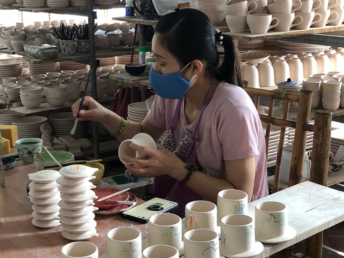 (2)大きなバッチャン村では大きな即売場を備えた工房を訪ね、絵付けの様子などを見学できます。この工房では電気炉で焼いているので、登り窯のある陶芸の村みたいなのを想像して行くと全くの興ざめですが、即売品の種類は豊富でした。小物でも数千円するので、ソコソコ高価だと思います。