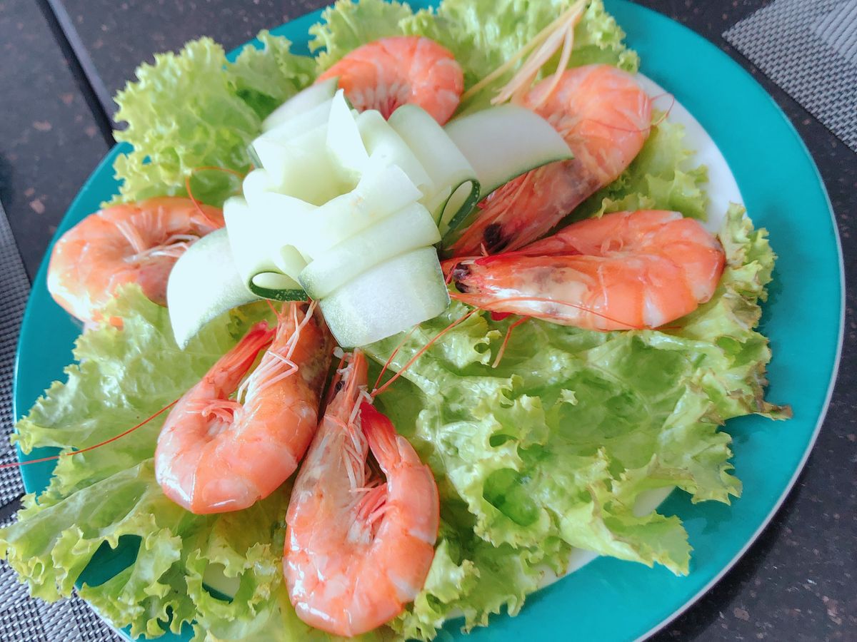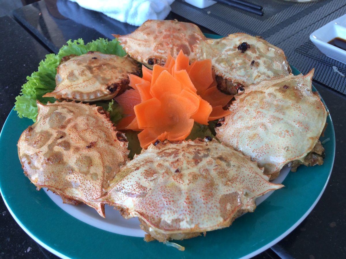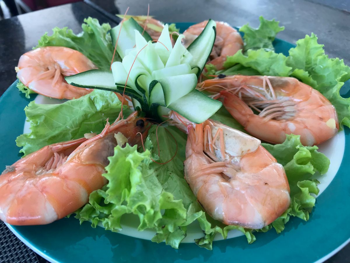船内でのご飯です。エビやカ二が出ました。大皿を5〜6人で取り分ける形でした。悪くはありませんが、街中の物価を考えると、もう少し豪華でもよいかな…と。量的にも少し少なめです。ドリンク類は別料金なのでミネラルウオーターにもお金が要ります。