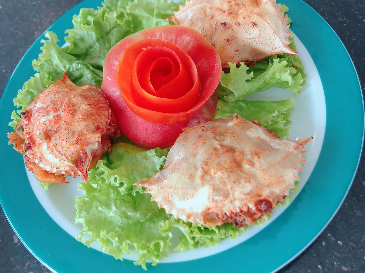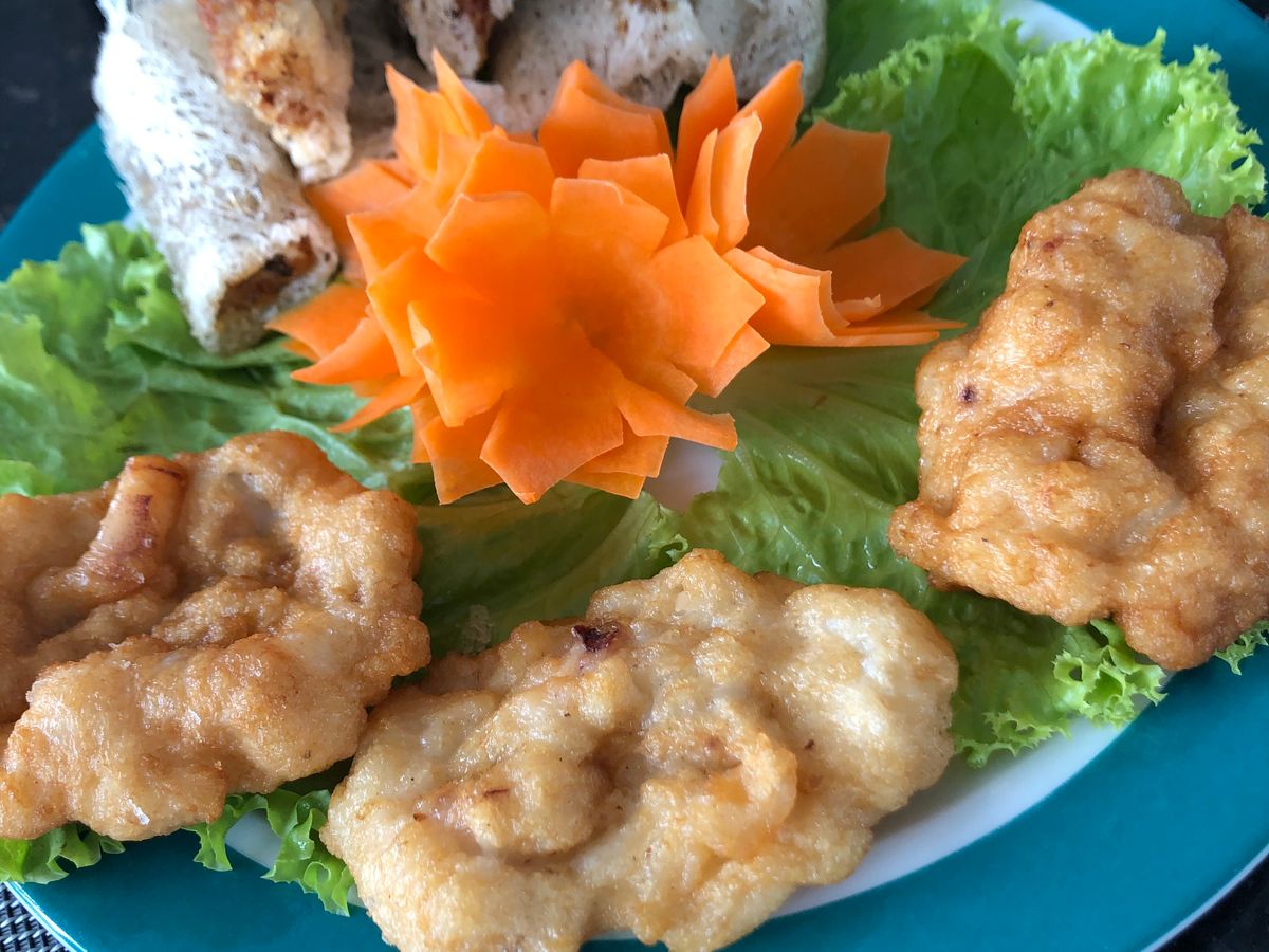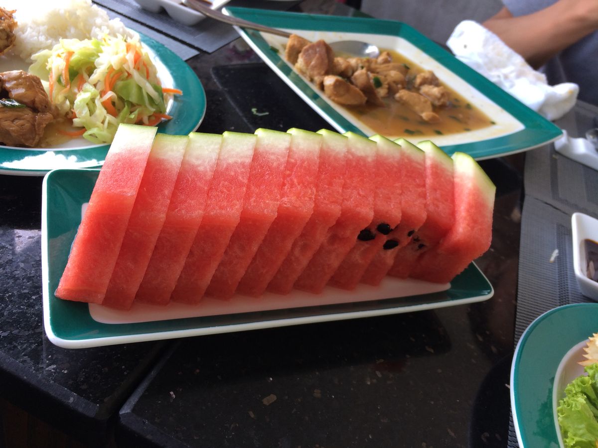 船内でのご飯です。エビやカ二が出ました。大皿を5〜6人で取り分ける形でした。悪くはありませんが、街中の物価を考えると、もう少し豪華でもよいかな…と。量的にも少し少なめです。ドリンク類は別料金なのでミネラルウオーターにもお金が要ります。