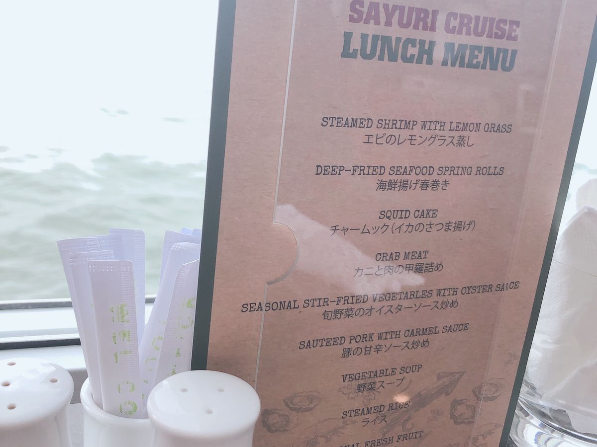 次にクルーズ船「sayuri」へ乗船。とてもきれいな船で、トイレもきれいで安心でした。船でのランチはどれも美味しかったです。ただ、飲み物は個人支払いですので、お金あるいはカードは持って行った方が良いです。この船は日本人ばかりなので、スリ等余分な心配はいらないです。私は用心してあまり現金を持って行かなかったのですが、飲み物や、お土産ものも少し売ってますので、買いたい方はお金は必要です。