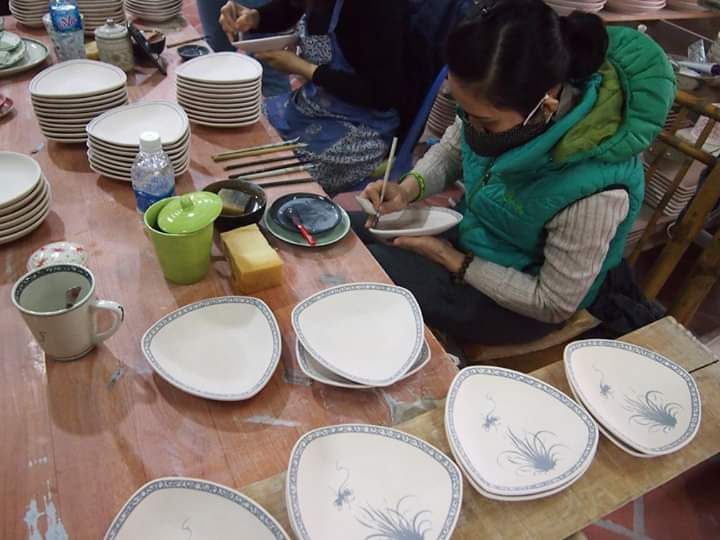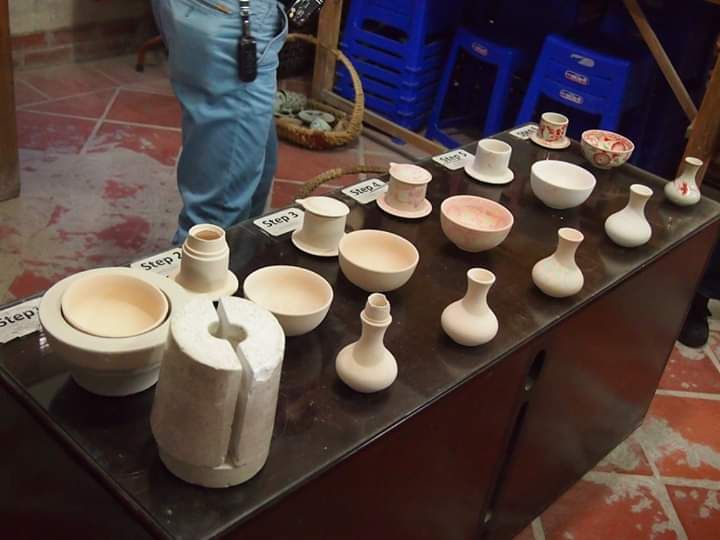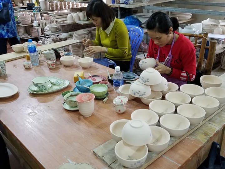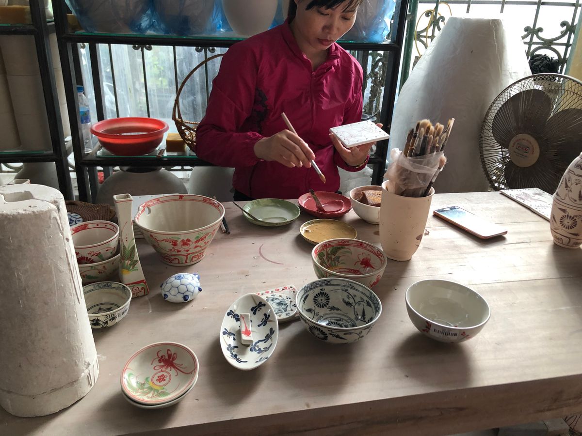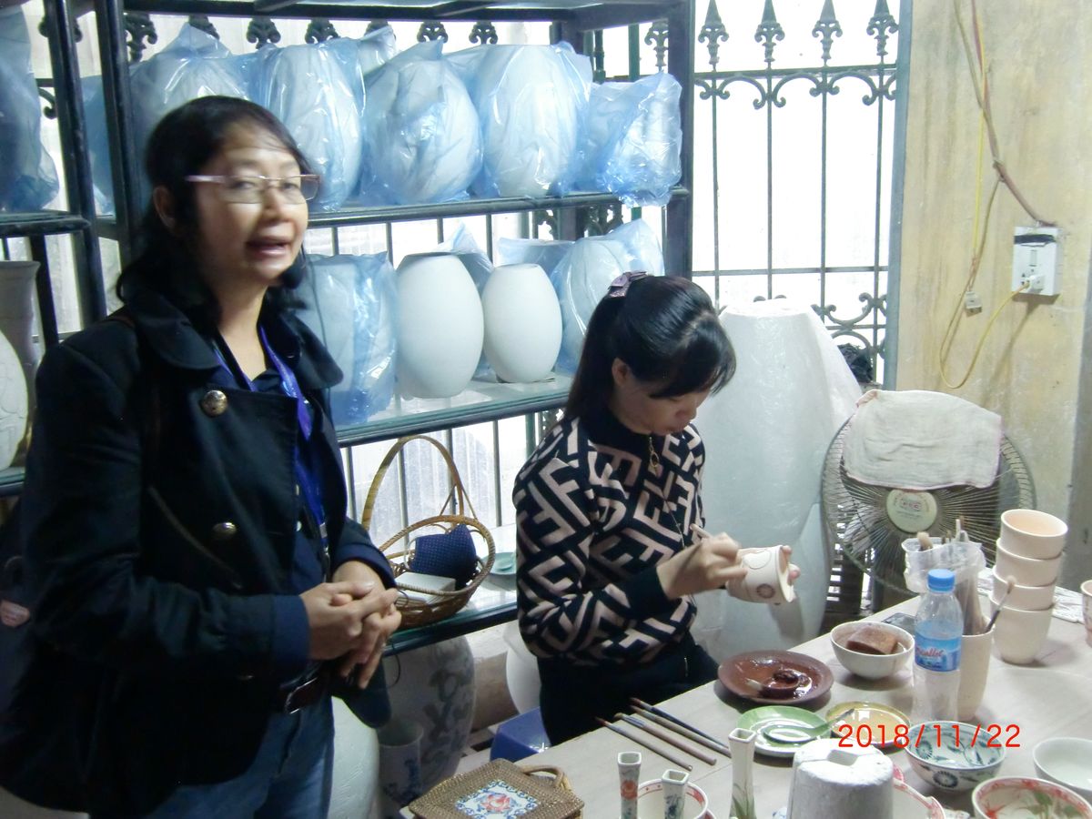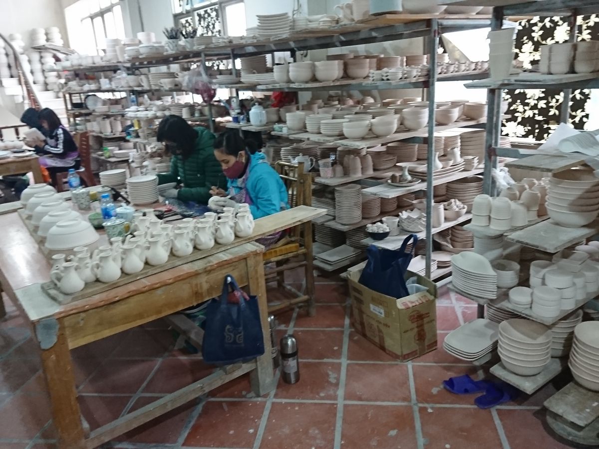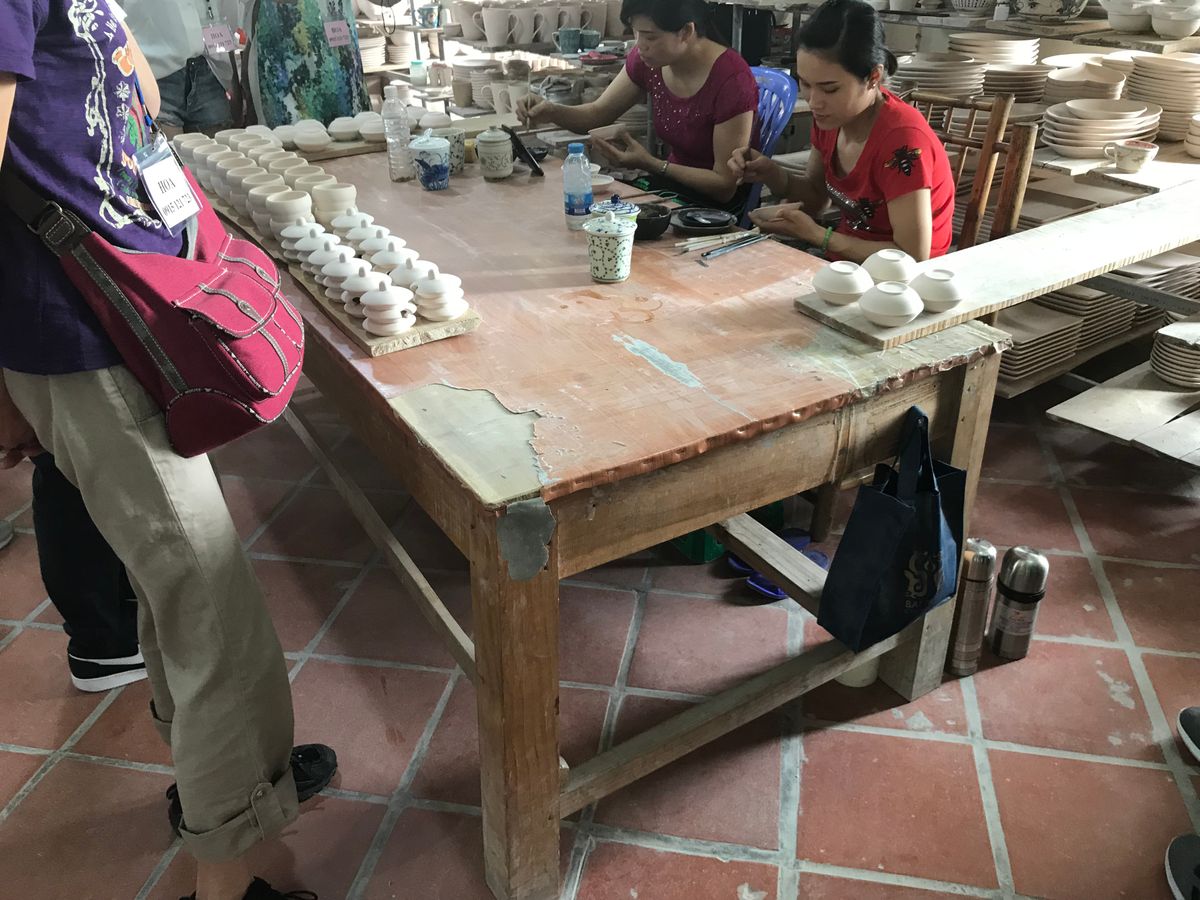 バスで30分走ってバッチャン村に着きました。ここは粘土の土の色を生かしたベージュや白の可愛い焼き物です。絵柄は菊、蓮の花、トンボなどです。壺やお茶碗など作るところから販売まで家族でやっています。皆手作業で絵付けなどは筆1本で下書きなしで失敗もしないで描いて行きます。コーヒーカップ1客1500円くらいから。1輪挿し1000円くらいから。