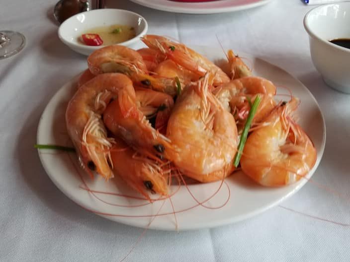 食事は海老やさつま揚げ風のものやてんぷら風の揚げ物、緑豆入りのおこわ等美味しく頂きました。ビール3ドル、水1ドル別会計です。