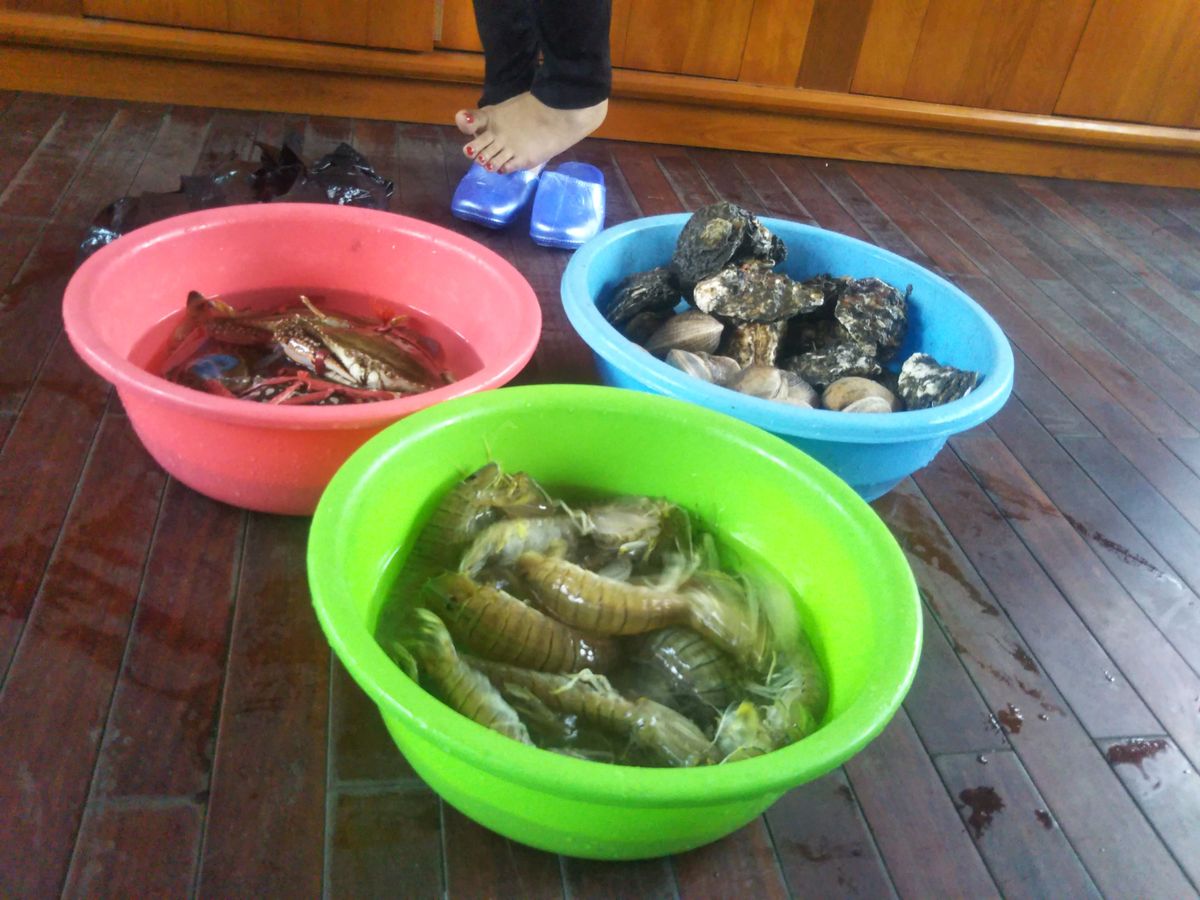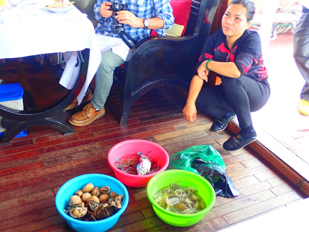 小船で乗ってきた現地の方から、シャコ・カニ・カキ・ハマグリを購入して、キッチンで焼いてもらうことが出来ます。