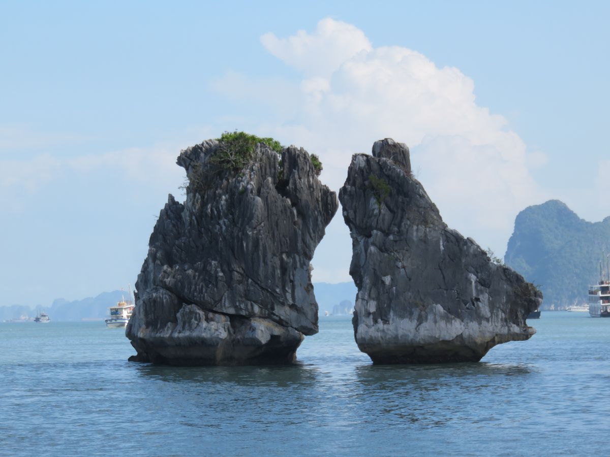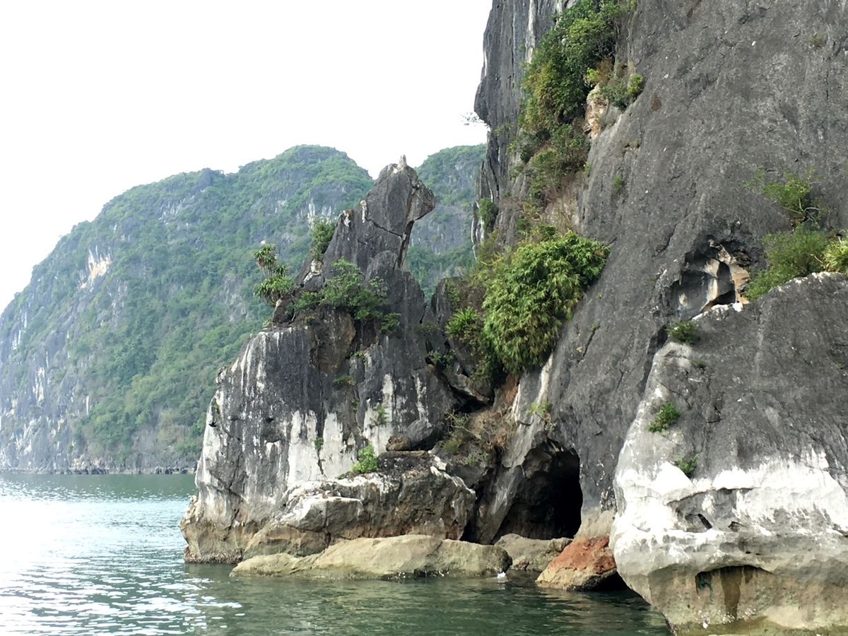 バッチャン村から車で約3時間、ハロン湾へ到着すると船に乗り込み出航です。船内での昼食は海鮮、野菜などとても美味しかったです。湾内はとても穏やかでそびえ立つ岩々は圧巻でした。ゴリラに見える岩や鳥が向かい合っているように見える岩など、ガイドさんが丁寧で分かり易く説明してくれ、写真も岩をバックに綺麗に撮って頂きました。
