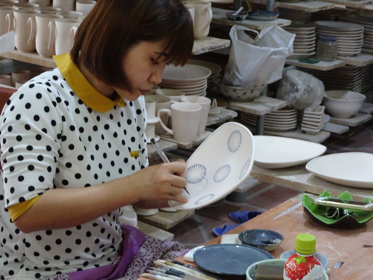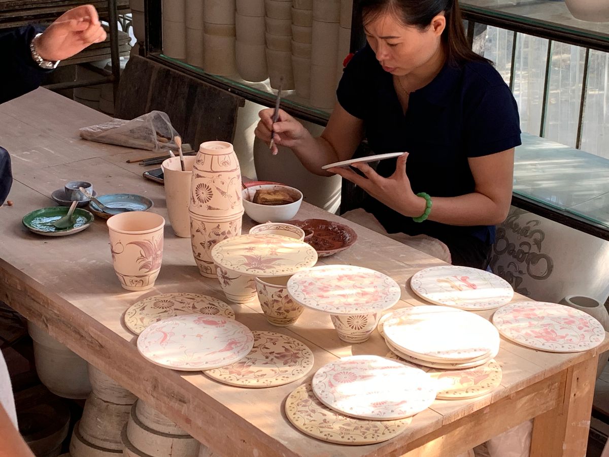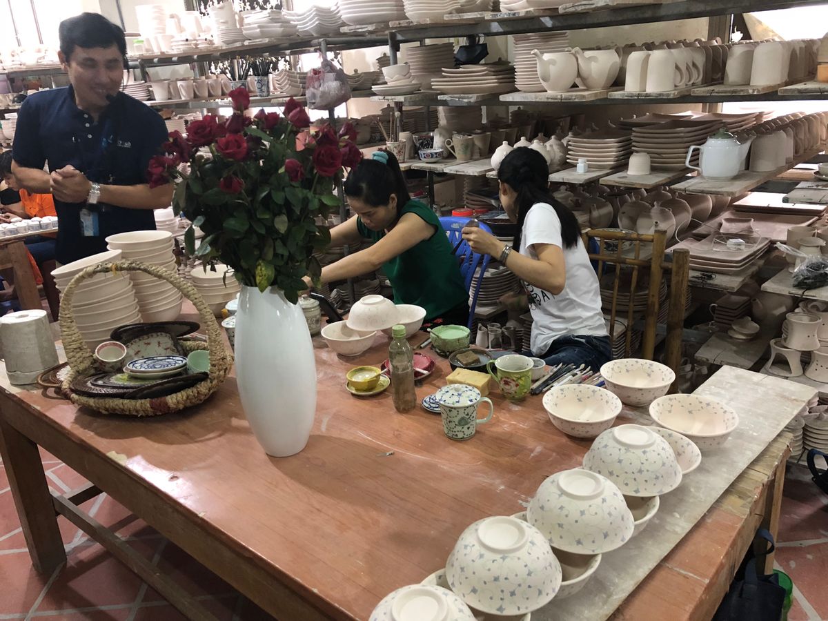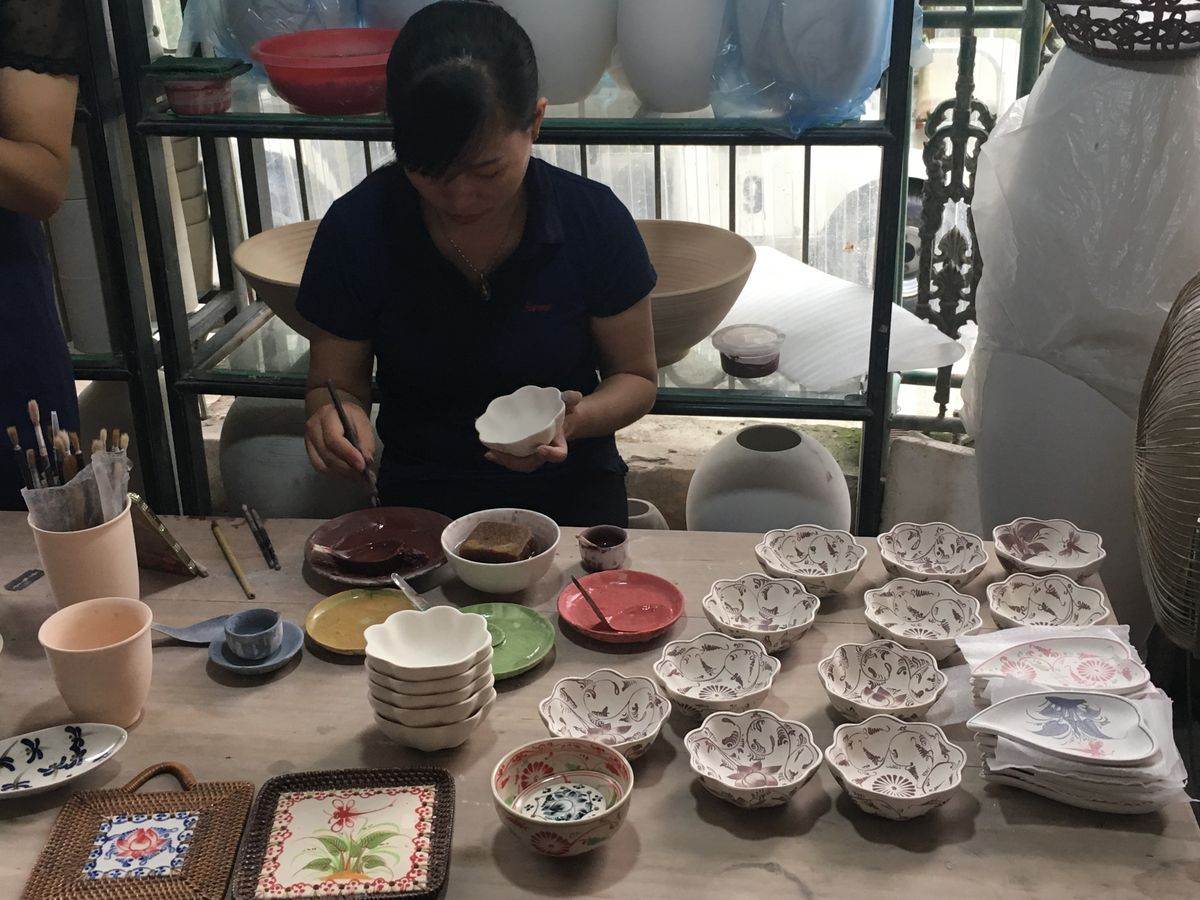 ツアーの最初の目的地、バッチャン村へはハノイ市内のホテルから車で約30分。バッチャン焼を作っている工房を訪ね、絵付けや型を作る工程などを見学しました。絵付けはとても繊細で、綺麗でいつまでも見ておきたいと思う程でした。