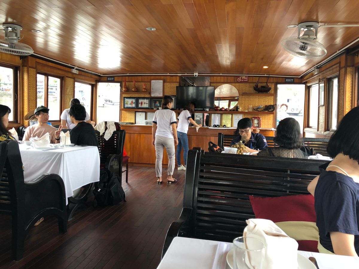 船内での食事はシンプルだが日本人の口に合いやすく美味しかった。飲み物は自腹で、ベトナムビールやベトナムワイン、ジュースなど。2階デッキからの景色や風はまた一段と良かった。