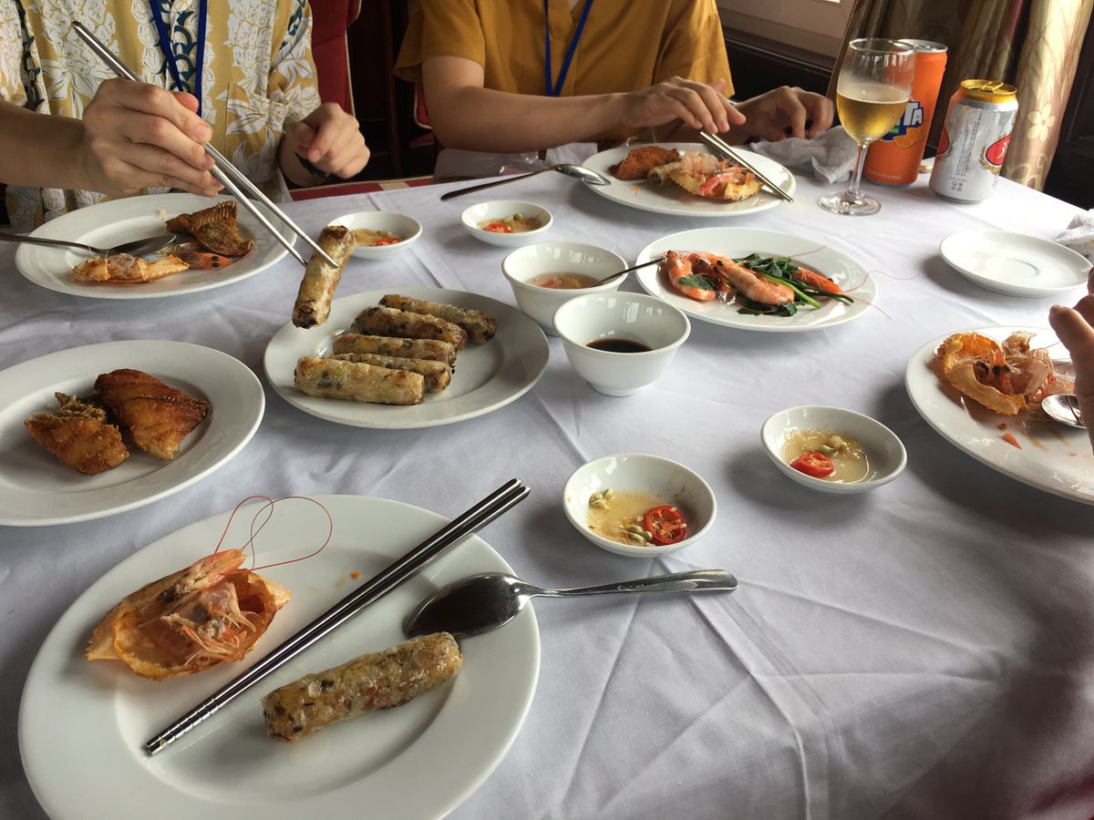 その後、トイレ休憩をはさみながら3時間ほどかけてハロン湾に到着。チケットの手配から乗船まで全て会社が手配してくれているのでスムーズでした。船内での食事は海鮮がメインで、窓からハロン湾の眺めを楽しみながらとても美味しくいただけました。自由にデッキへ出て写真も撮れるので、食べて外へ出て、また食べて…といった具合。この日は生憎の曇りでしたが、思ったより見晴らしもよく、満足できる景色でした。