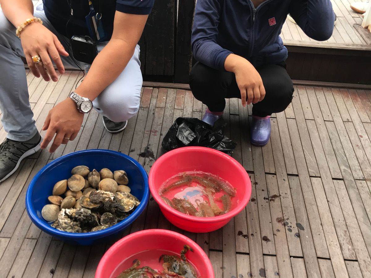 穏やかな海を見ながらの昼食が満足でした。現地の人が船に魚介を売りにきてくれます。大きな貝やシャコ海老やあさり。それらを買って船の厨房でその場で調理。新鮮ですごくおいしかったです。オススメです。食後に島に上陸して鍾乳洞を歩きます。ちょっとした運動になり、鍾乳洞も想像以上に見事でしたよ。バッチャン村は時間が少なかったせいか、ちょっとお買い物ツアーっぽい感じでした。それでもたくさん陶器を買えたので満足しました。