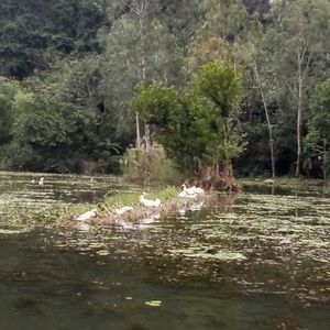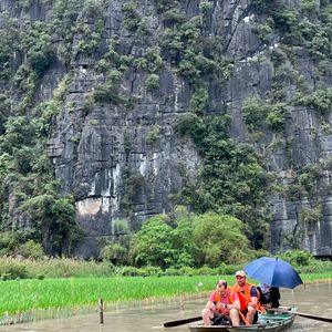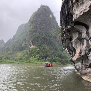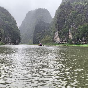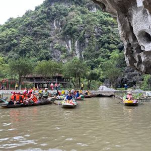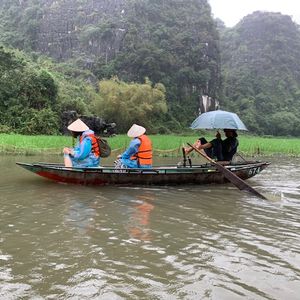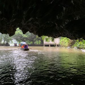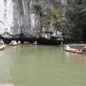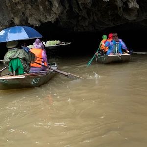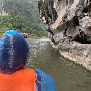 小さな手漕ぎボートに乗り、川を下るのですが、雨風が強かったため、ボートが揺れドキドキしました。とてもスリリングでした。船頭さんがオールを足で器用に漕いで川を下っていくと大きな競り立つ岩々、頭スレスレノの洞窟等見どころ満載です。川面に浮かぶ蓮の花、アヒルの群れに遭遇したりと美しい景色に魅了させっぱなしでした。