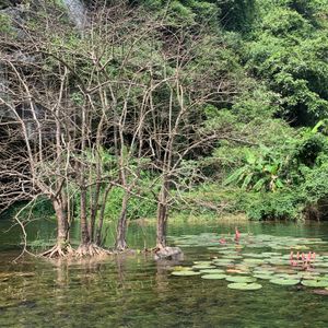 当日は朝ホテルに8時半集合だったのですが、5分前にはガイドの方が来てくれていました。日傘がないと大変かもしれないというアドバイスをもらい日傘は持っていなかったので薄い羽織を日焼け防止に持って行きました。雨の多いハノイとのことで友人は大雨の中タムコックの小舟クルーズに参加し、少し怖かったという話を聞いていたので雨かなどうかなとは思っていたのですが、当日は天気に恵まれ、青空とともに大変綺麗な景色を臨むことができました。風も心地良く吹いており暑過ぎない印象でした。ニンビンに着いたところで傘帽子を40000ドンで購入しましたが、船では日傘を貸してくれるようでした。ライフジャケットも借りられます。途中でニコンのカメラを持ったおじさんが近づいてきて「撮るよー」と言ってバシャバシャと撮られてしまいましたが、値段を聞いてしまい、10枚で1000円と言われ、「また後で」と言って去って行きました。こんな素晴らしい景色の中で自撮りではない写真はなかなか撮ってもらえないかもしれないので帰ってくるまでに考えておこうと気軽に考えていましたが、折り返し地点で果物を売っているおばさんからマンゴーだけを買おうとしたら他のものも勝手に付けられ、船頭さんの分もと飲み物とお菓子をその分追加されて断れず、言い値の1000円でそれらを買いました。現地の果物を食べながらのクルーズはより一層贅沢に感じました。ただフルーツに1000円は高すぎたよなあと少し後悔していた為、写真は断ろうということになり帰路を進むと、あのカメラマンのおじさんが既に現像したのであろうアルバムを持って待っていて、わたしたちの舟を足で止めて売ろうとしてきました。 断ると、「また後でって言ったのに...」のような言葉を投げかけて舟を止めていた足も離さず去ろうともせず..わたしたちも現像を既にしてあるため心苦しくなり少し考えているようにも見せていたのもあったのと、船頭さんも多少グルなのかその場をなかなか動こうとしなかったのもあり10分ほど押し問答という形になりましたが、なんとか離れられて船着場に戻ることができました。船頭さんは道中、果物のおばさんやカメラマンさんのことはなにも話さなかったのですが、それ以外の湖に咲いている花についてや、写真を撮るときのアドバイスなど、英語は喋らないようでしたがジェスチャーも交えて一生懸命わたしたちに話しかけてくれました。1時間半程のクルーズだったので汗だくになりながら舟を手や足で漕いでくれ、良い経験が出来たこと大変感謝しています。船着場に着いたらガイドさんがいてくれると共に先ほどのカメラマンの仲間とおもわれるおばさんがおり、先ほどのアルバムを再び売りに来られましたが、ガイドさんが「むりに買わなくても大丈夫です」と言ってくれ、おばさんにも話をしてくれたので大変助かりました。しかし最終的には撮って現像してくれたということと500円でよいと言われたのもあり、買いました。中身は同じ写真が何枚かありましたが、これも良い思い出です笑