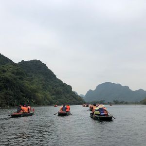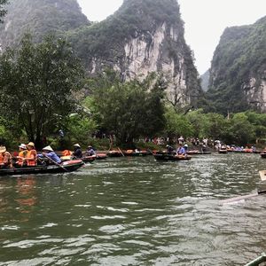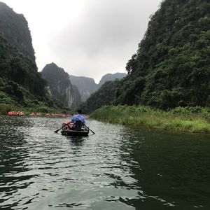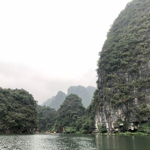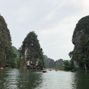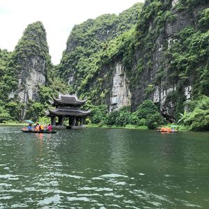 地元の方も沢山来られる人気の観光地でベトナムの祭日という事もあり凄く混んでました。平日はもっと空いてるらしいです。手漕ぎボートに乗るまで20分~30分待ったのですがボートの数が多いので流れも速く苦痛では無かったです。クルーズのコースは3パターンあり私たちは中間の2時間くらいのコースにしました。小雨の降る中、船頭さん合わせて4人ボートに乗りこみ出発!まず自然にできたカルスト地形の美しさと神秘さに感動しました。隆起した地形を間近に見る事が出来る為かなり迫力があります。手で触れる事ができるくらい狭い洞窟をくぐり抜けるのも楽しいです。途中で雨も止み心地よい風が吹いてき てボートクルーズは最高でした。