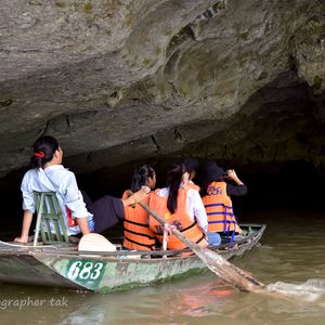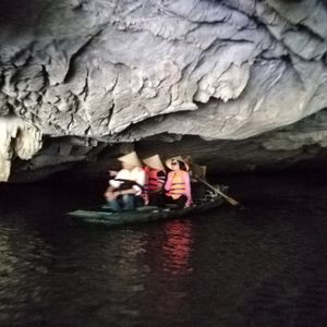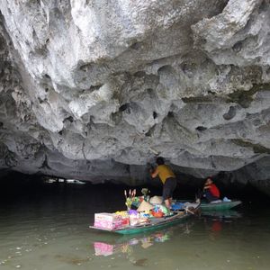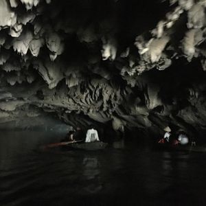 暗くてなにも見えない洞窟。「Be careful 」と船頭に言われ頭を下げる。岩の天井から落ちる滴は冷たい。配られたライフジャケットは暑いので途中で脱いだ。