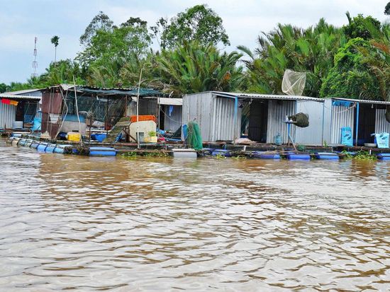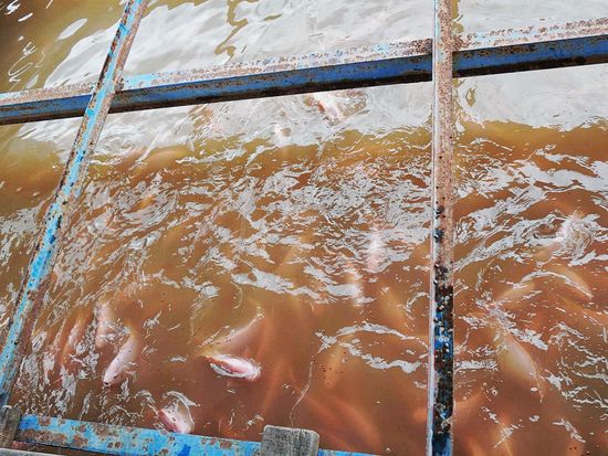 再びモーターボートに乗りクイ島へ向かう途中、穏やかな川の流れに浮かぶいかだで、地元の人々が魚を養殖する様子を見学します