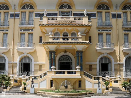 フランス植民地時代のインドシナ建築、モザイク床、バルコニー、螺旋階段などが特徴のホーチミン市美術博物館。絵になるロケーションに衣装が映えます。