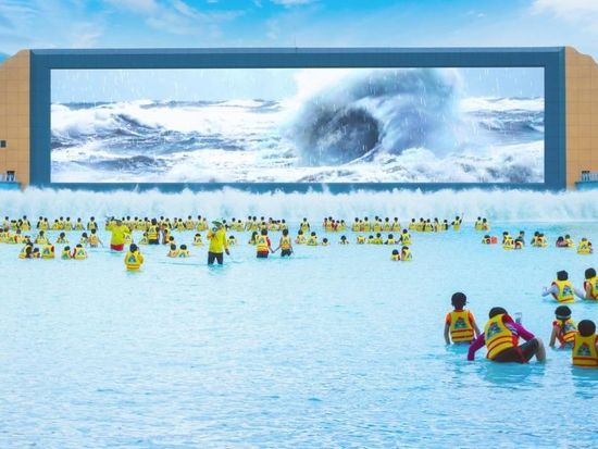 2,000インチ超の巨大LEDスクリーンや、高さ4メートルに達する波、映像と音響が融合した迫力ある演出が魅力のエリア。