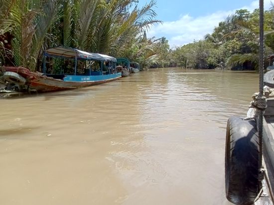 ヤシの木が生い茂る間を進む手漕ぎボート。行き交う地元のフルーツ売りの船や他の観光用の船の間をスルスルと進む船漕ぎさんのオールさばきを楽しみながら進みましょう。ノンラー(ベトナム帽)で写真撮影もおすすめ!