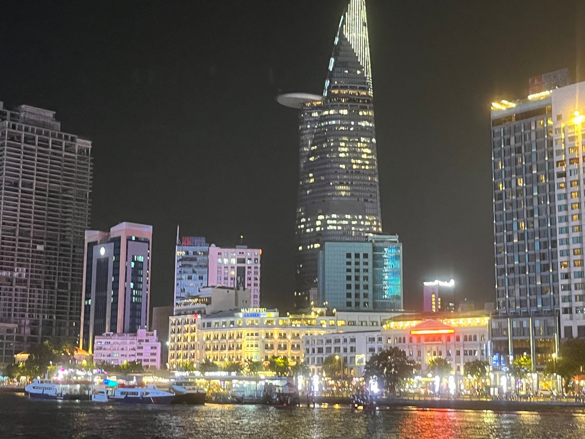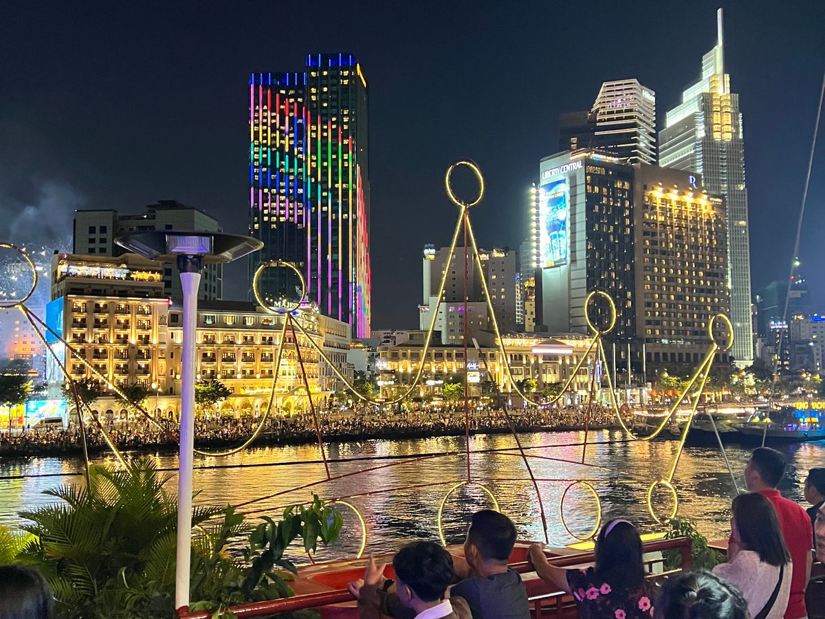 ホーチミン到着日に参加しました。食事はビュッフェで色んな料理がありましたが、生春巻きのライスペーパーがカチカチで噛み切れず、ホーチミンの生春巻きは、これがスタンダードなのかと思いましたが、後日出された生春巻きは普通だったので、水分不足の具材だったのかと思いました。食事中はホーチミンスタイルの賑やかな歌と演奏を堪能し、食事後はデッキに出ました。そこでのサイゴン川から見る夜景はとても綺麗でした。また、一人の若い船員にとても良くしてもらったので、一緒に写真を撮りました。良い記念になりました。