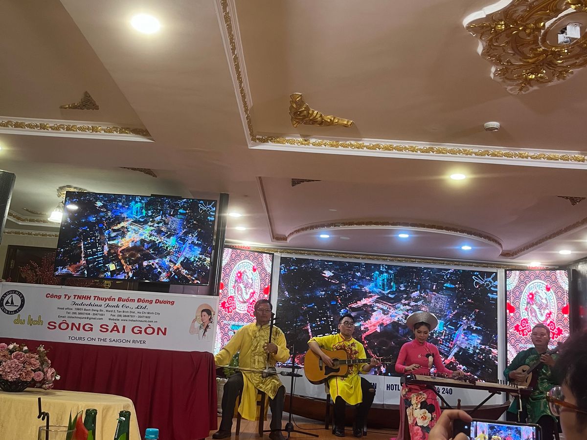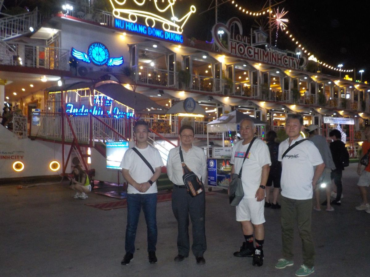 船員の方々(その内の一人:ベトナム大学の学生アルバイト)がとても親切で、料理(バイキング)もおいしく、屋上のデッキで数十名の観光客とサイゴン川の風に吹かれ、優雅な気分に。後半は舞台でパンチのきいた歌と演奏にほとんどの人が共鳴し、一緒に歌ったり、ダンスに興じたりとても楽しかった。