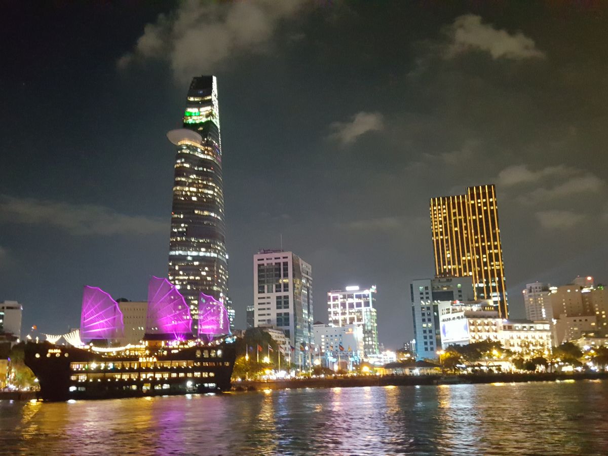 メコン川デルタクルーズは手漕ぎのボート。私たちは乗客だけど人気のクルーズでメコン川デルタ地区は渋滞。でもその分キョロキョロ見廻せて楽しさは倍増でした。島では「え~?」みたいな動物や昆虫と触れ合い、南国フルーツを頂き、下船後のランチも充分でした。ホテルに一度戻り(約2時間ほど)汗を流し、くつろいで夜の部へ。水上人形劇はあいにく休演の為、ビテクスコ・フィナンシャルタワータワーで夜景を満喫。そして、サイゴン川でのディナークルーズ。ここからの夜景も素敵。