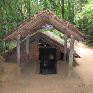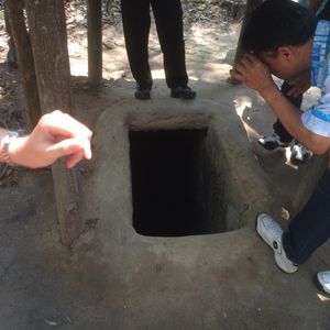 クチ到着、戦争という悲惨な状況下、地下トンネルはベトナム人の知恵であり、ベトナム人の強さを感じました。トンネルの入り口に入ってみました。狭く、深く、出るときは腕の力のみで自分の体を持ち上げなければならないので、自信のない方はご注意を。団体さんは代表者のみ写真撮影だったようなので、タイミングがよく入れてラッキーでした。地下トンネル内の入り口は観光用に広げられていました。案内してくれた男性にチップを求められましたが、特に執拗にはされませんでした。