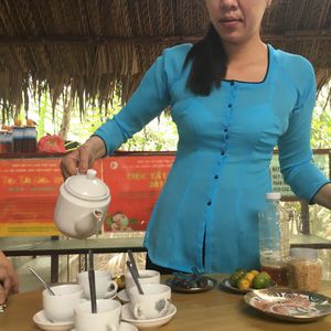 ロイヤルゼリーの強引な押売りはありませんでした。伝統音楽の演奏会ではチップをあげる方もちらほら。ココナッツキャンディが30,000ドン(150円)だったので購入。レストランで飲み物(23,000ドン〜)を注文する方もいましたが、持参のお茶でも大丈夫でした。