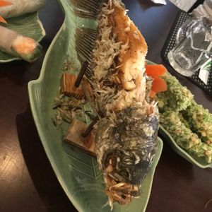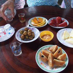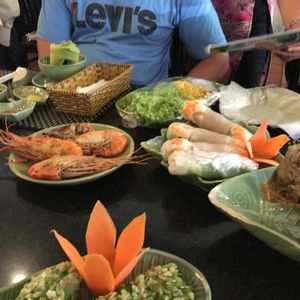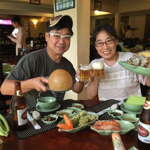 今回は見学で時間が押していたため、途中14時過ぎの昼食です。オシャレなレストランで名物の象耳魚の生春巻き、真ん丸の揚げ餅など地元料理を美味しくいただきました。