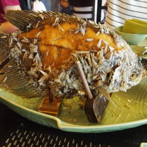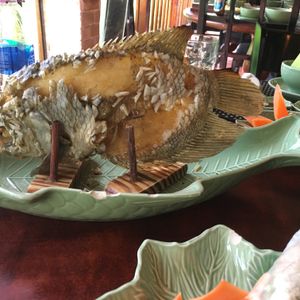 お昼は象耳魚!1匹丸々とあって、インパクト抜群です。真ん丸のお餅も美味しくいただきました。