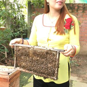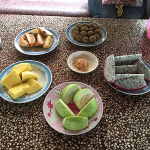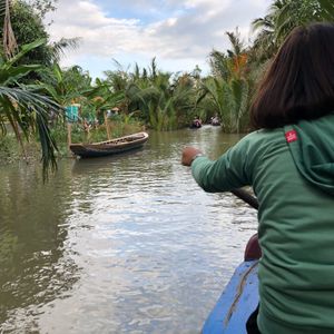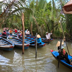 ●13:40 メコン川の船着場着。中洲の島に船で移動し、街路の果実の木をみたり、最近富裕層の隠居先として人気で豪邸が増えている話を聞きながら散策。特産の蜂蜜屋やココナツ屋(飴や石鹸)に寄る。勧誘は緩めで断りやすい。ココナツ石鹸を40kドン(200円)で買う。ココナツ飴は午前中のみ作っており、午後は制作風景は見られない。手漕ぎボート乗り場手前で、フルーツ(ザボン、ドラゴンフルーツ、サポジラ、龍眼、ジャックフルーツ、パイン)を頂き生演奏と生歌を聴く。全くやる気のない態度と表情がシュールで20kドン(100円)チップを渡す。チップはやらなくても全く問題ない。5~10分ほど手漕ぎボートに乗る。漕ぎ手は、田舎っぽい服に傘をかぶったおばちゃんだったり、Tシャツ短パン傘なしのお兄ちゃんだったりする。自分たちのボートは写真映えする前者だったのでよかったが、後者だったら不満だっただろう。日本からの修学旅行生とバッティングし、少し待ち時間あり。