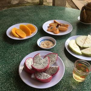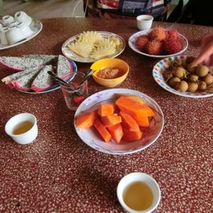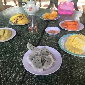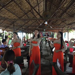果樹園ではドラゴンフルーツ、竜眼、パパイヤなどの南国のフルーツを食べながら民謡を聞きます。チップを要求されますが、私たちのグループでは払う人はいませんでした。希望者にはおじさんが首に錦蛇をかけてくれますが、とてもいい経験になりました。