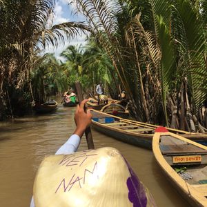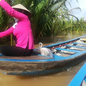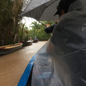 メコン川では、ハチの巣を持ったり、蛇を首に巻いたりできます。どちらも怖そうですが、大人しいので、なにかされることはありません。最後に手漕ぎのボートに乗りました。まるでリアルジャングルクルーズよようでした!(もちろん、ワニなどは出てきません。)