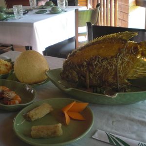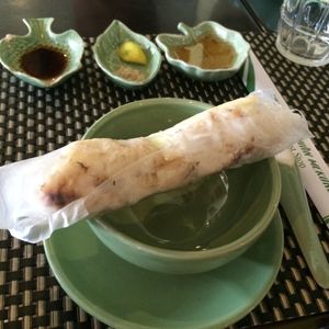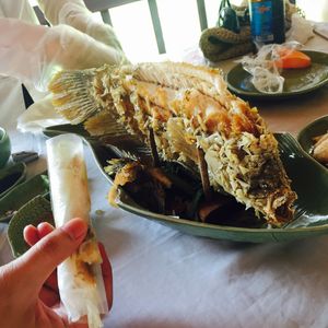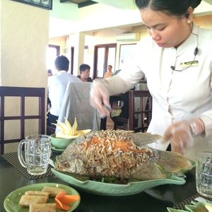 お昼のエレファントフィッシュは最後までスタッフが取り分けるべき。スタッフは使い捨て手袋でほぐしやすいところだけ取り分けて、あとは自分でどうぞと言われても、4人で1匹の魚を直箸で突くわけにもいかず、残してしまいました。春巻きの皮も人数分用意されおらず、気遣いが足りない印象。