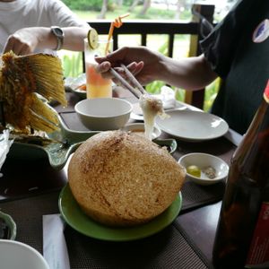 悲しい戦争の遺構ではありますが、家族で見てきました。縦穴に潜って隠れる体験をしたり、いろいろな種類のワナを見たり、興味深い体験でした。いまでも、ベトナム戦争の後が残されているという実感でした。汚れても良い服装、汚れても良い靴で、特に、靴はドロドロになるとのガイドブックの前評判でしたが、乾期だったため、地面もぬかるまず、歩きやすかったですが、とても暑かったです。象耳魚は、白身で淡泊でとても美味しかったです。中でも、子供たちのお気に入りは、ソイ チェン フォン(風船餅)。中は普通のお餅ですが、外の揚げた皮が香ばしくて、とても美味しいです。昼食後のメコン川クルーズは、中洲の島に移動して、いろいろな体験。みつばちの巣を持ってみたり、蛇を首にかけたり。ミツバチは、東洋ミツバチでしたので、とてもおとなしい蜂です。島の中には、たくさんのフルーツの木があり、手漕ぎボートで水路の移動も楽しかったです。