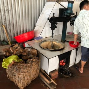 メコン川クルーズでは離島まで大きめの船で行きます。観光業で成り立っている島でハチミツやココナッツキャンディの解説と営業を受けます。ココナッツキャンディは沢山入って120円とそこそこ安いです。