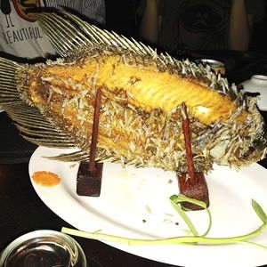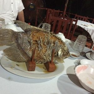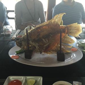 夕食が付いていたのですが、内容はまあまあ良かったです。象耳フィッシュは最初出て来た時ちょっと驚きました。この日のツアー客は11人、初対面の人とどうやって分けて食べればいいのだろう?と心配していたらお店のスタッフの方が魚をほぐしてライスペーパーで巻いてサーブしてくれました。魚は揚げてあるので、クリスピーでおいしかったです。ツアーの参加者の方と楽しくお食事が出来ていい思い出になりました。