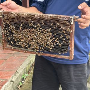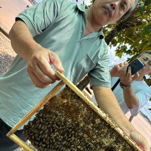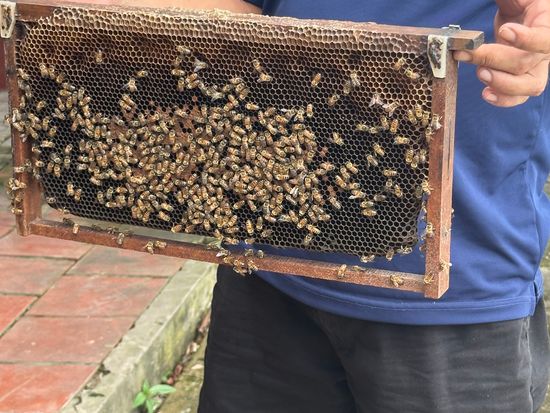 メコンの大河に驚きながらまずはエンジンボートに、島に辿り着くと蜂の巣箱とご対面。
