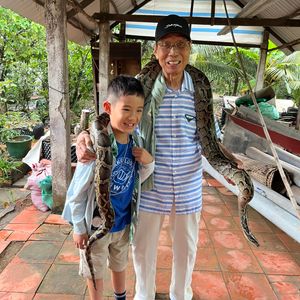 雄大なメコン川の景色を目の当たりにしながら、蜂蜜のお茶を味わい、ココナッツを使ったお菓子、美味しいフルーツを楽しみました。ちょっと怖かったけどヘビとの触れ合いも貴重な体験。ベトナムらしさがギュッと詰まったツアーです。