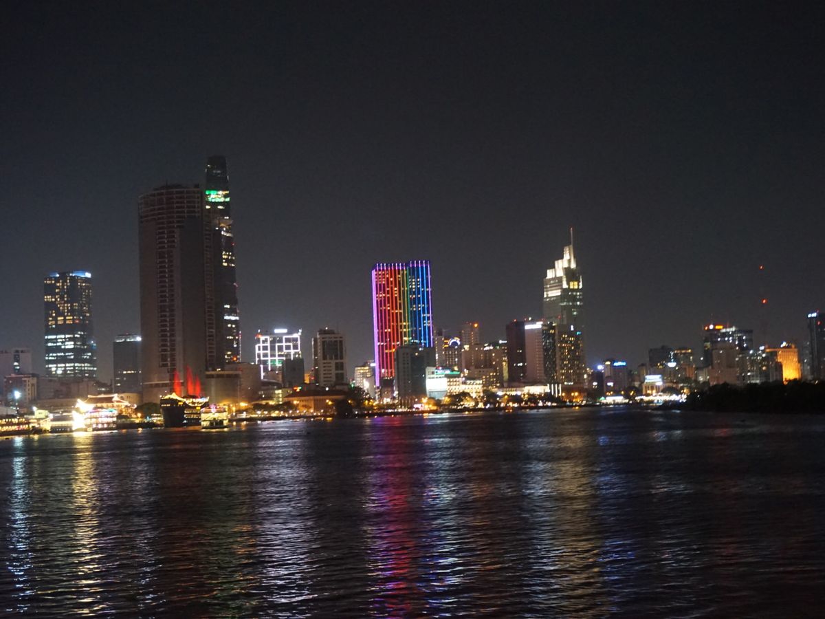 メコン川デルタクルーズは手漕ぎのボート。私たちは乗客だけど人気のクルーズでメコン川デルタ地区は渋滞。でもその分キョロキョロ見廻せて楽しさは倍増でした。島では「え~?」みたいな動物や昆虫と触れ合い、南国フルーツを頂き、下船後のランチも充分でした。ホテルに一度戻り(約2時間ほど)汗を流し、くつろいで夜の部へ。水上人形劇はあいにく休演の為、ビテクスコ・フィナンシャルタワータワーで夜景を満喫。そして、サイゴン川でのディナークルーズ。ここからの夜景も素敵。