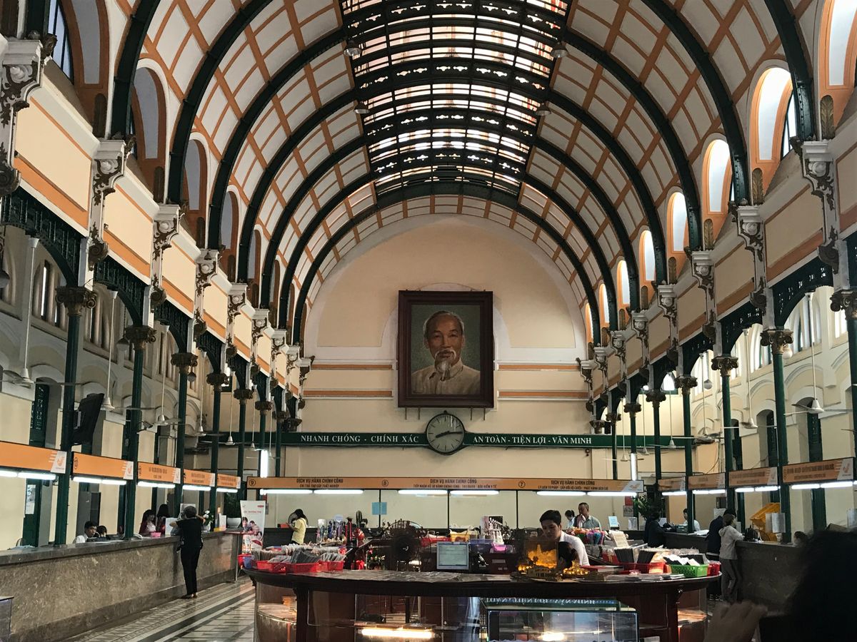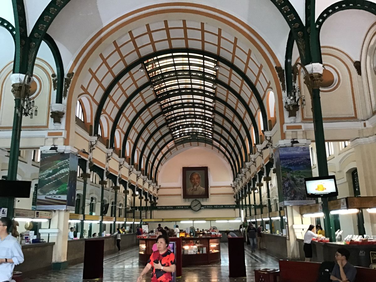 ツアーは座席幅がゆったりした文字通りラグジュアリーバスで、とても乗り降りがし易かったです。8:10に出発し、道路状況を見ながら最初にピンクの教会へ。日曜日でミサがあった為、中には入れず、外からの写真撮影だけとなりましたが、結婚式の様子が垣間見えたりして、面白かったです。8:40頃に、戦争博物館へ。第二次大戦後の欧米に翻弄されたベトナムの歴史が写真展示されていて、じっくり見ていると時間overになりましたが、ガイドさんに柔軟に対応していただきました(たまたま、ツアーはうちの家族だけだったので)。9:45頃、統一会堂に移動し、一通り、ガイドさんに説明を受けながら回りました。壁に掛けられた絵画まで一つ一つ丁寧に説明いただき、興味深く見ることができました。10:30頃、中央郵便局へ。その後少しだけ雑貨店に立ち寄って貰った後、ベンタイン市場に移動し、本来はそこである程度見学してからホテルへ帰るのですが、当方は食事もしたかったので、市場まで送って頂いたところで終了とさせてもらいました。色々とワガママを聞き入れていただき、雨の中ではありましたが、楽しく過ごすことができました。ラグジュアリーバス、とてもお薦めです。