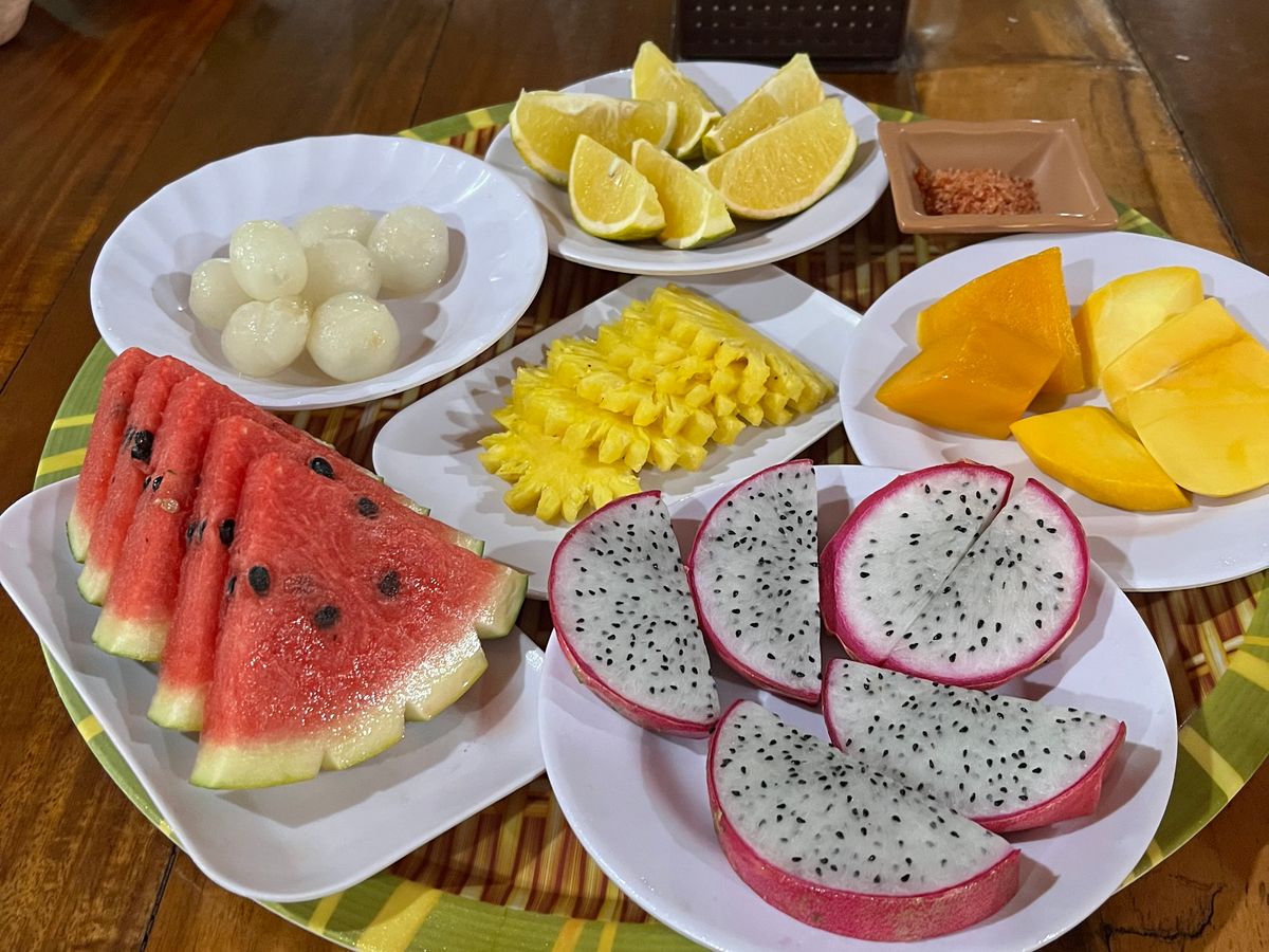 歌に歓迎されながら上品な甘さの柑橘類、ランブータン、パイナップルは塩をつけ頂き、スイカも甘く、パパイヤ、ドラゴンフルーツとお腹いっぱい。
