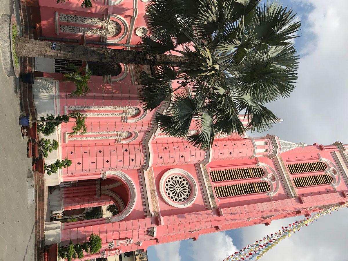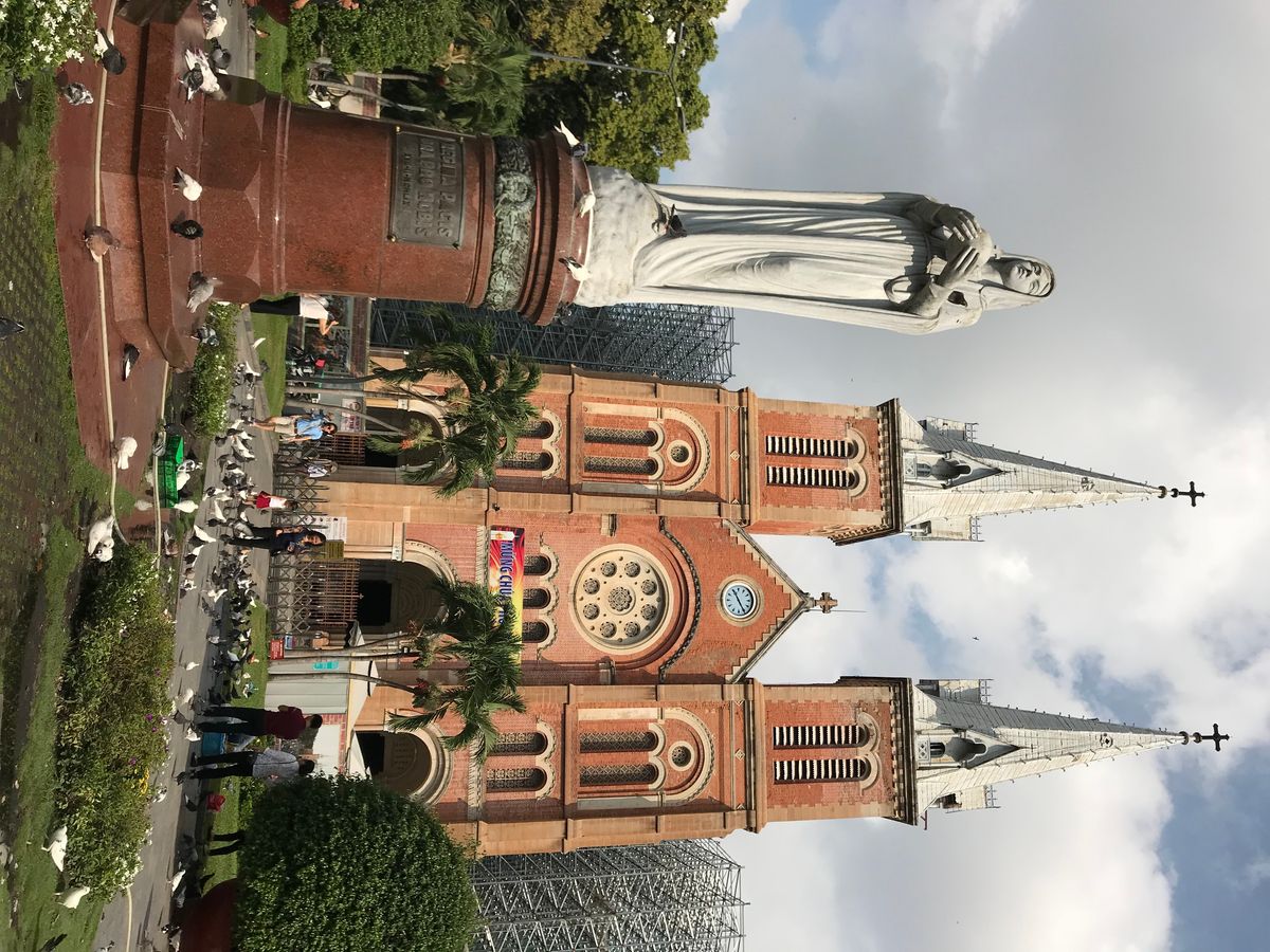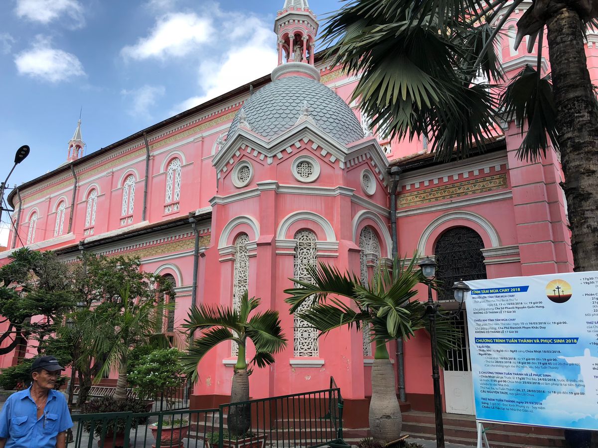 ホーチミンのメインの観光は歩いてでも回れそうでしたが暑いです。気温33度蒸し暑いなか写真を撮ってるだけでも汗だくでした、帰って来て冷房が効いてるバスはありがたかったです。聖母マリア教会は工事中で中には入れませんでした、ピンクの教会も以前は中までで入れたそうですが今は入らなくなったそうです、でも外から見るだけでも綺麗で充分満足できます。統一会堂や戦争証跡博物館もガイドさんのわかりやすい説明がありベトナムの歴史が少しわかりました。帰りも高島屋前で降ろしてもらって大変満足できたツアーでした。