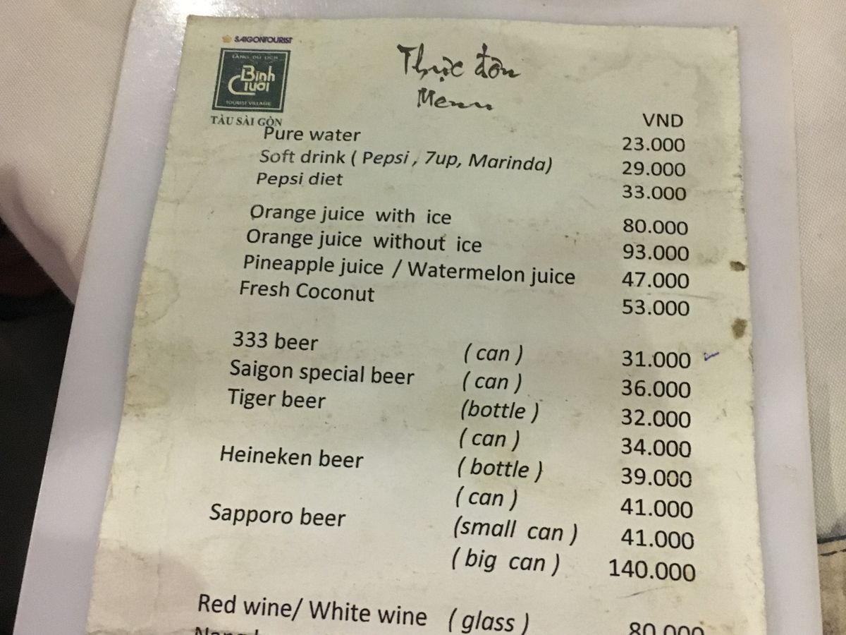 サイゴン川ディナークルーズは食事がコースで決まっており、座ったらどんどんお皿が出てきます。ドリンクは別会計ですが、333を2本飲んでも62,000ドン(約300円)です。