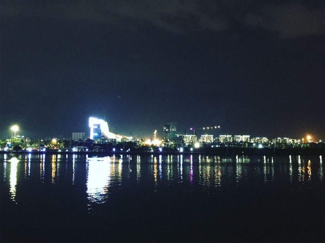 クルージングはイマイチでした。ネオンきらめく方向とは逆に進み、荷物を積み込みする船ばかりを見ました。夜景は遠目に見えます。
