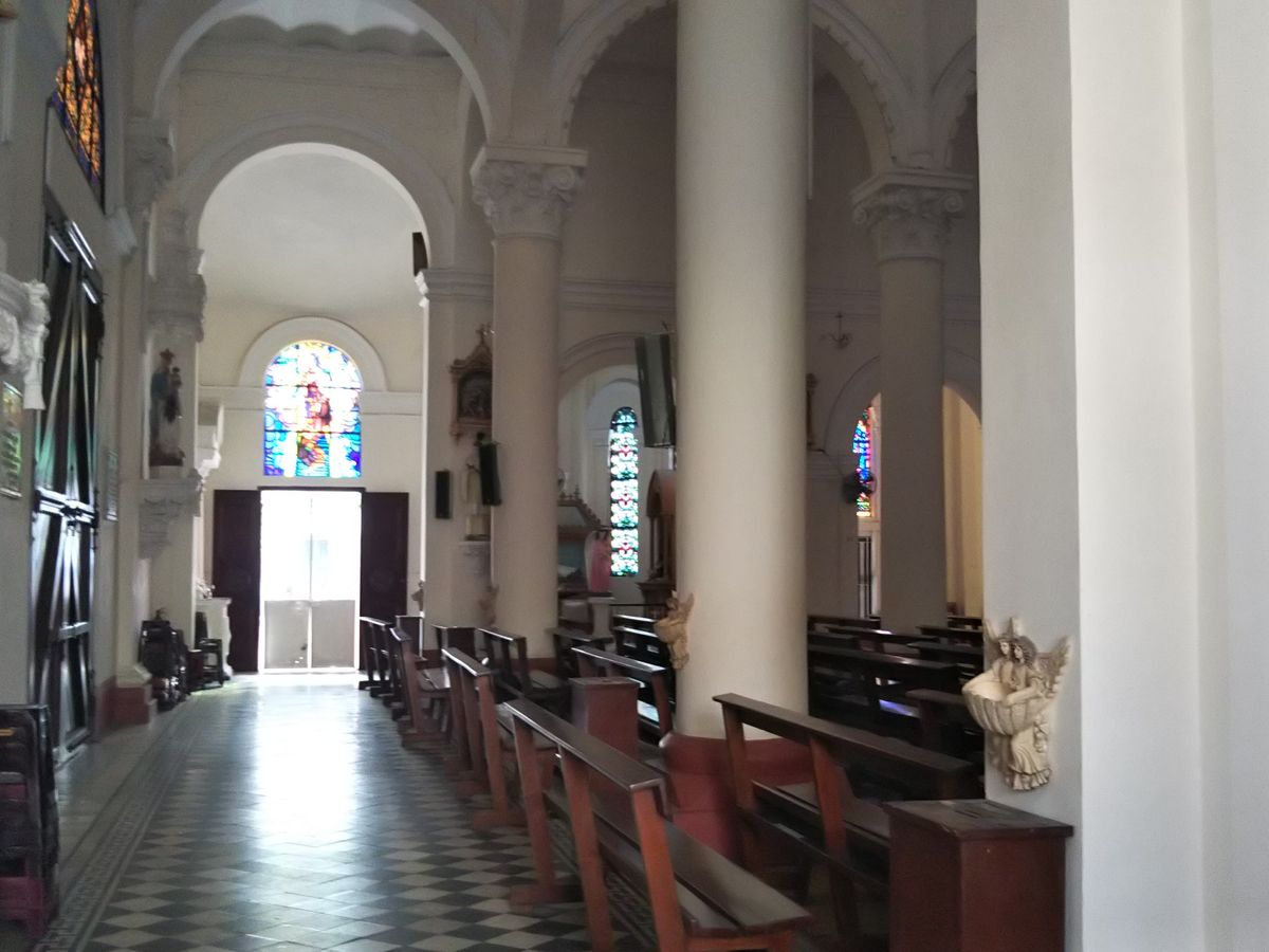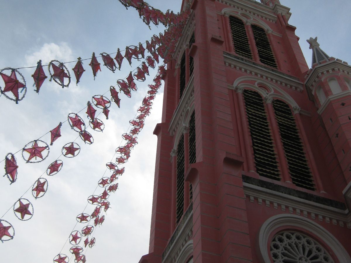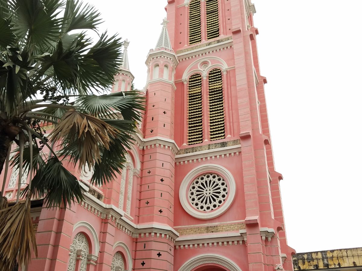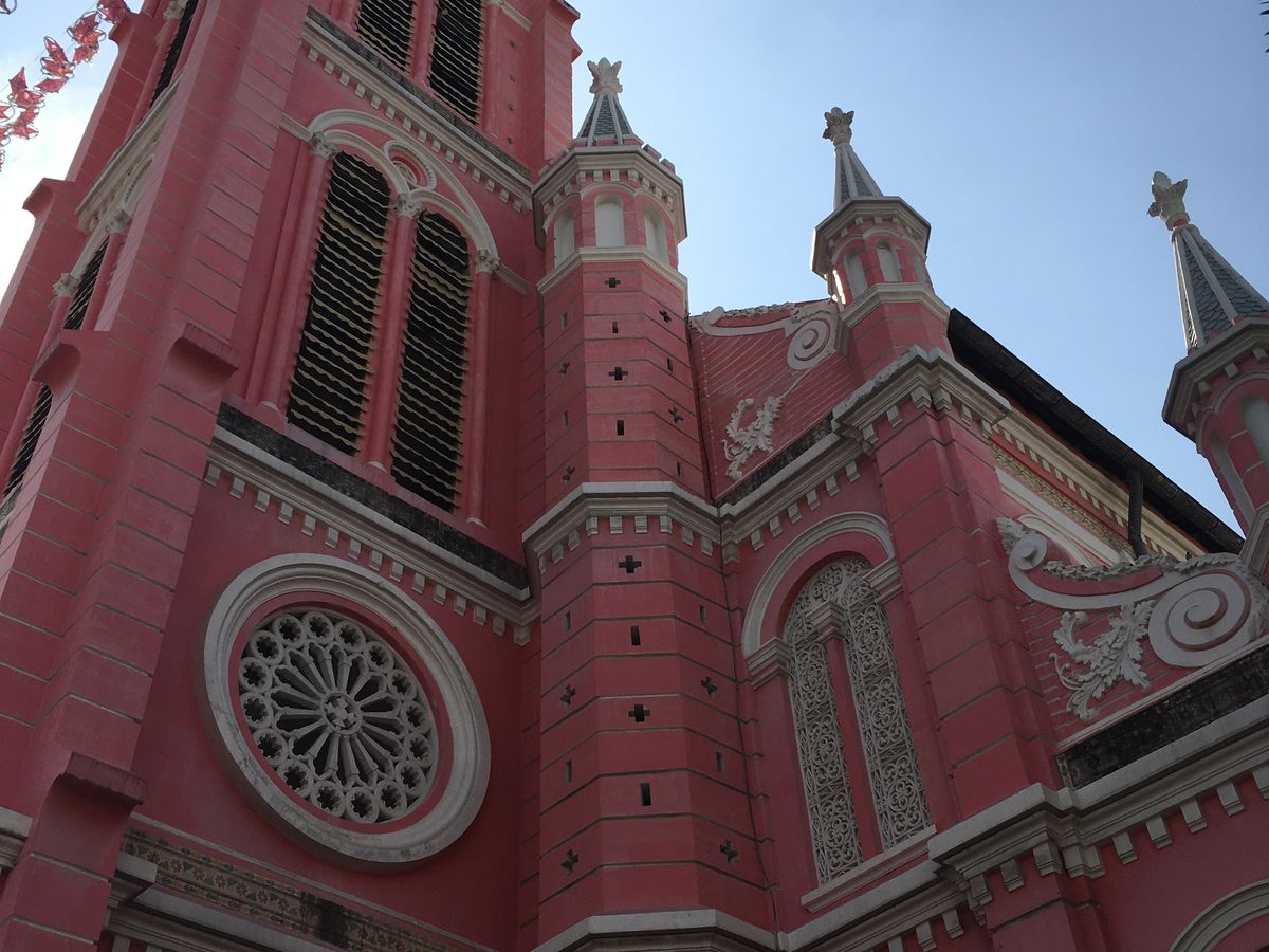 その後、このツアーならではの、ピンクの教会(タンディン教会)に行きました。この教会はインスタ映えということで人気が出すぎて内部の見学が禁止になってしまったということで、内部は窓からのぞくだけでした。でも、ステンドグラスなどは良く見えるので綺麗でした。写真を撮る時間も十分とっていただいたので、サイゴン大教会の代わりに楽しめました。