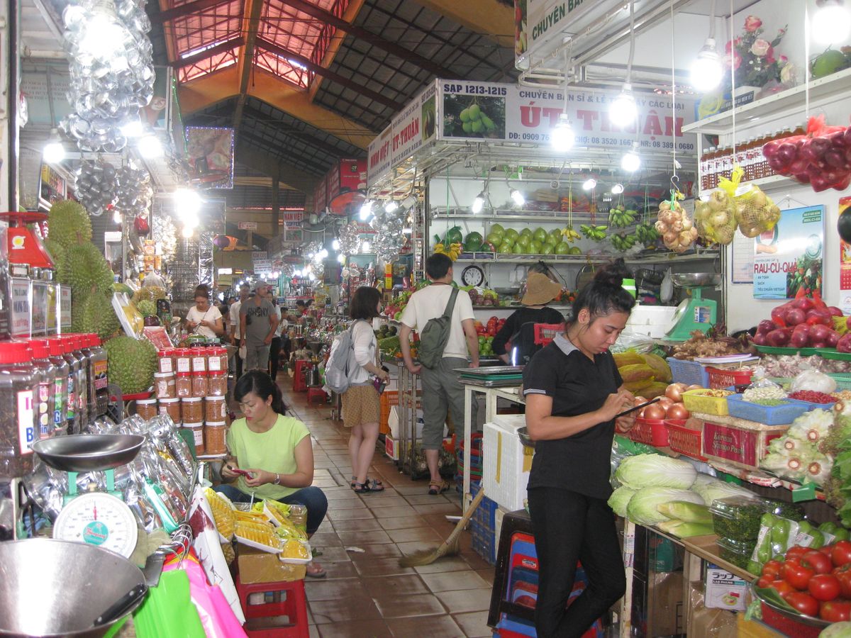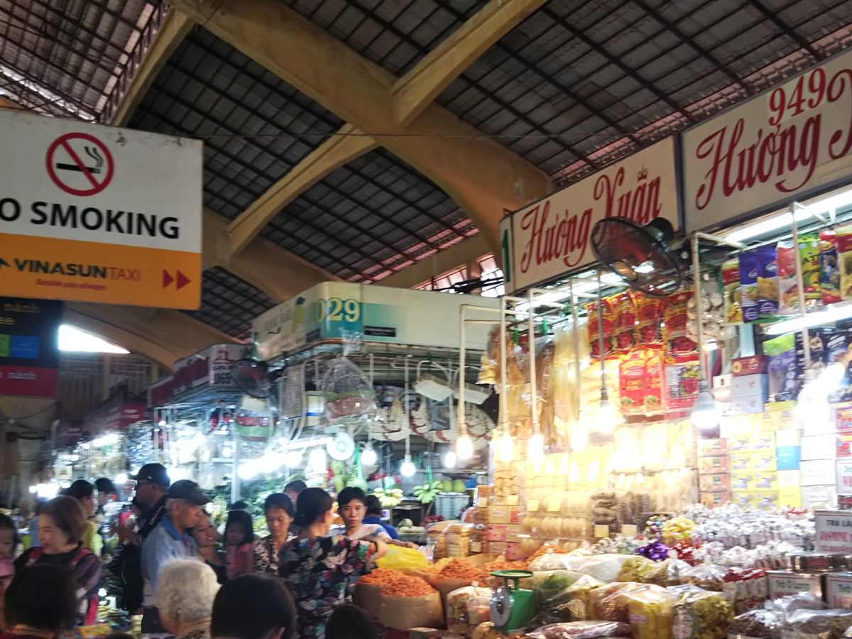 次はベンタイン市場かな、と思っていると、またドンコイ通りに戻って休憩ということで、お土産物屋さんに。何を買わされるんだろう、と一瞬身構えましたが、お茶をサービスしてもらい、それほどプッシュもなかったので何も買わずにベンタイン市場に向かいました。ベトナムに着いてから色んなガイドさんにボッタクリとスリに気をつけろ、と口を酸っぱくして注意されたので、ちょっと緊張の市場回りとなりました。ここもガイドさんとは別れて自分たちだけで小1時間の自由時間。結局立ち止まるのも怖くて、何も買わず何も食べずで終わってしまいました。ガイドさんに一緒に回ってくださいと頼んだ方が良かったかな?体験談を読むと、ガイドさんによって本当に色々みたいだったので、どの程度希望を言って良いのかがわからなくてちょっと後悔。よく考えたらこの日は自分たちだけだったので勇気を出して頼んでもよかったのかもしれません。