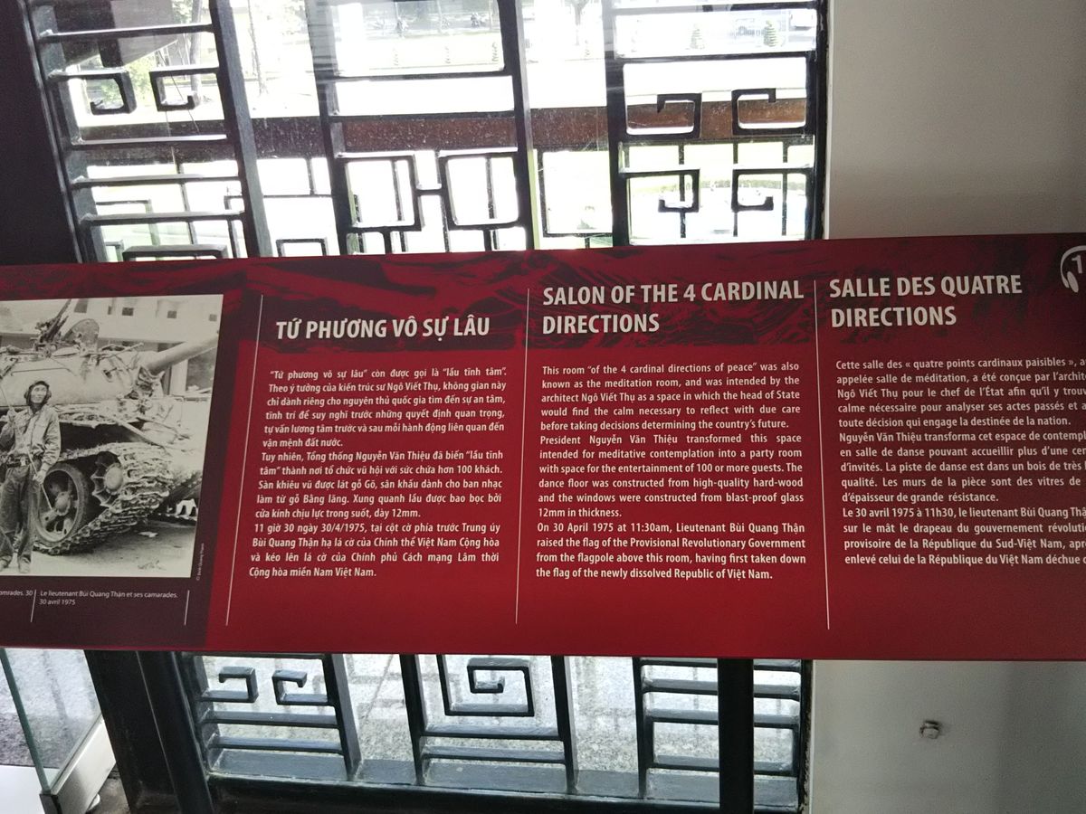 続いて統一会堂に行きました。事前に全く予習はしていなかったのですが、充分に時間をとって内部を詳しく説明していただき、とても興味深かったです。内部の案内板は英語、フランス語、ベトナム語だけだったので、日本語でガイドしていただいてよかったと思いました。