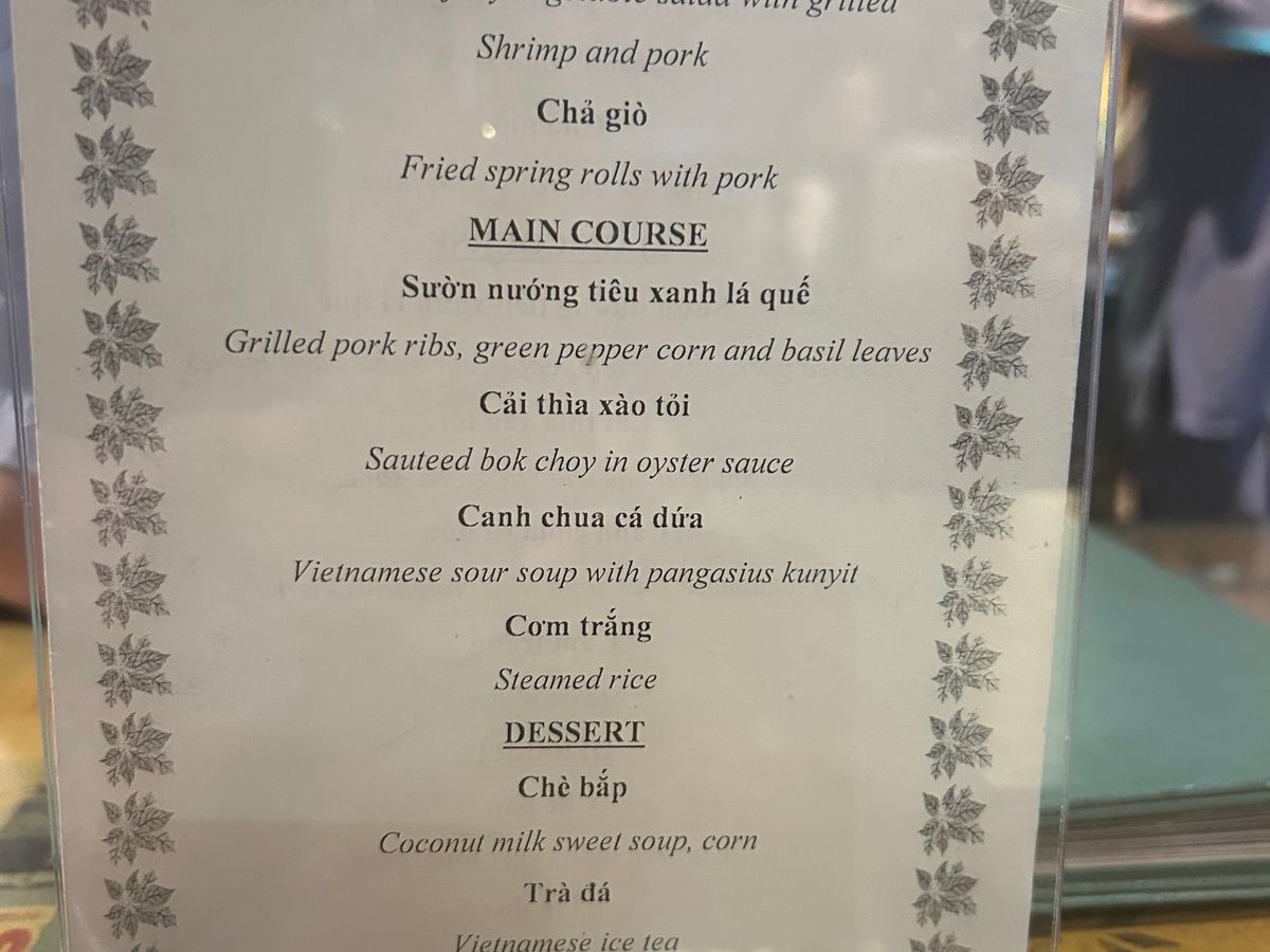 食事も、ベトナム料理に期待してましたが、量が少なくて、お腹いっぱいにはなりませんでした。また、飲み物は別料金でしたが、お茶みたいなのが付いていたので、頼まなくてもいいかなと思いました。