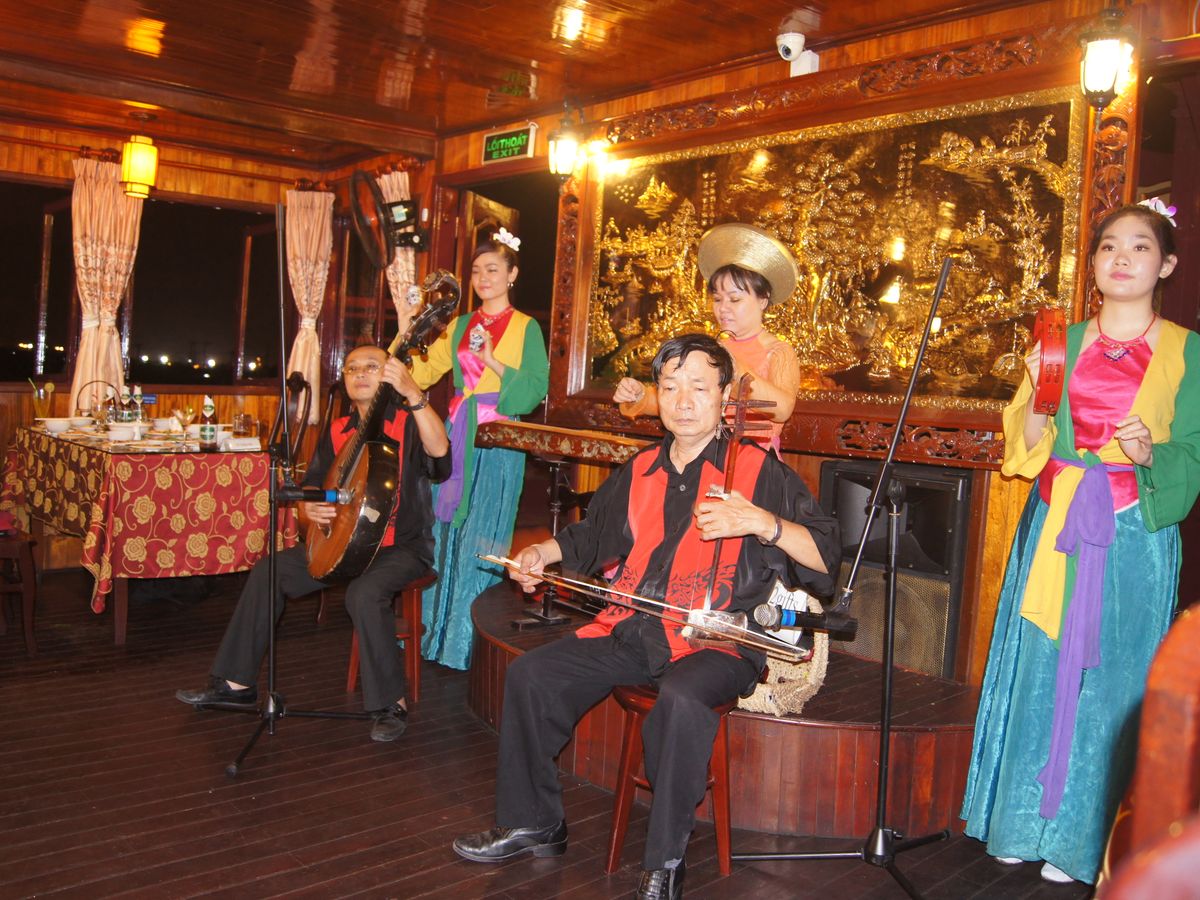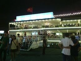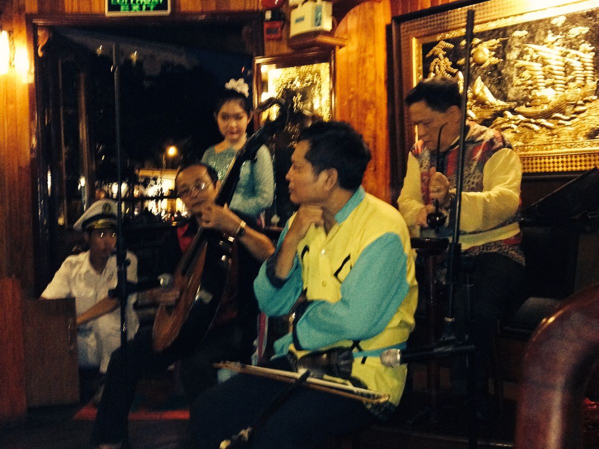 人形劇の後ろはディナークルーズ。ただし出港はディナーを食べ終わる頃で、船が止まっていると5月のホーチミンシティは結構蒸し暑いです。味はなかなかですが、1人での参加はあまり想定されていないのか(事実私だけでした)、多人数のテーブルに比べるとどうしても料理が貧弱に見えてしまいます。船内にはステージもあり民族楽器の生演奏や舞踊などが行なわれます。夜景の方は綺麗といえば綺麗ですが神戸や長崎といった待のような「圧巻」というほどでななく、そのせいかお客さんも景色よりステージという感じでした。