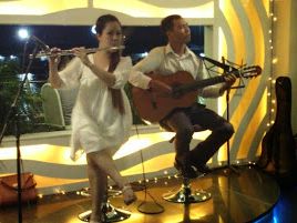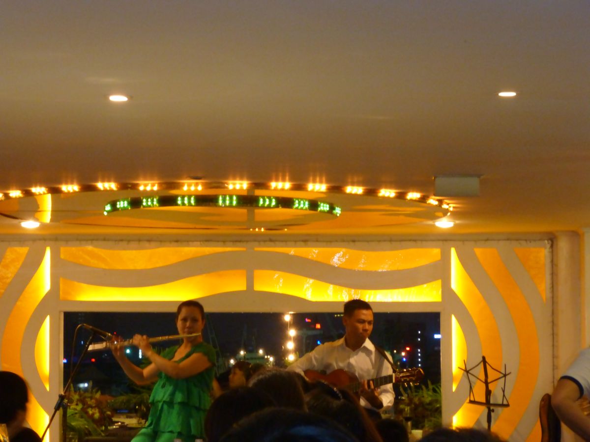 その後のサイゴン川ディナークルーズは船上で涼しく、食事が終わった頃に出航し、ホーチミンの美しい夜景が楽しめます。参加当日はフルートとクラシックギターの趣味の良い生演奏もありました。料理は期待したほどではありませんでした…。