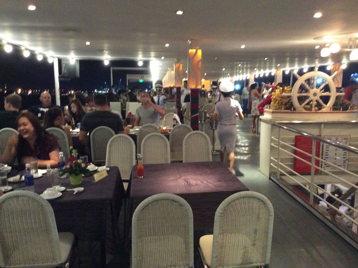 子供の分の料理は無かったはずですが、それでも量は結構有り、十分でした。食事が終わってから1時間ほど待たされ、ようやく出港。夜景はやっぱりそれほどでもないですが夜風が気持ち良く、日本では普段あまり味わうことのできない体験をさせて頂きました。
