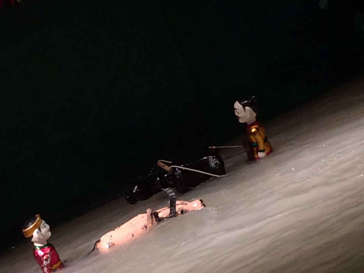 人形劇は思ったよりスピード感があり、人形が激しく動くと、最前列には水しぶきがかかるほどでした。内容も興味深く、たびたび笑いも起こっていました。ガイドブック等で事前に予習しておくと、登場人物やストーリーが理解できて、より楽しめると思います。